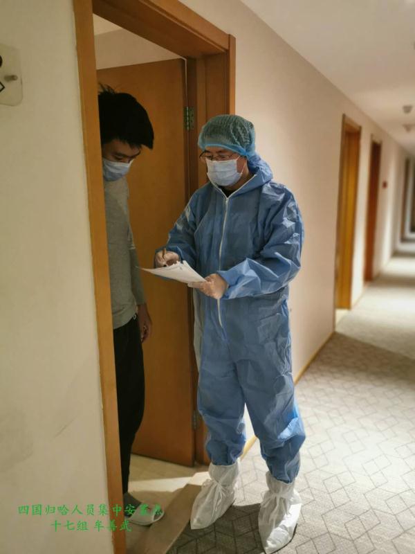 執行指揮辦法官助理楊凱剛剛解除醫學隔離,在妻子參加黑龍江省第四批援鄂救援醫療隊奔赴武漢的當天,立即請戰加入疫情防控「第一梯隊」,隨着哈爾濱市「內防」形勢向好,境外疫情擴散態勢明顯,為響應「外防輸入」工作部署,楊凱等7名幹警主動報名,積极參加日本、韓國、意大利、伊朗四國來(返)哈人員集中安置工作,24小時與被安置人員同吃同住,共同隔離。