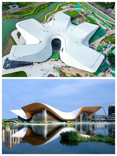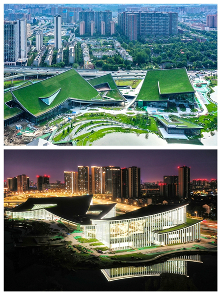 建設中的天府藝術公園藝術館和圖書館白天和夜晚的景色