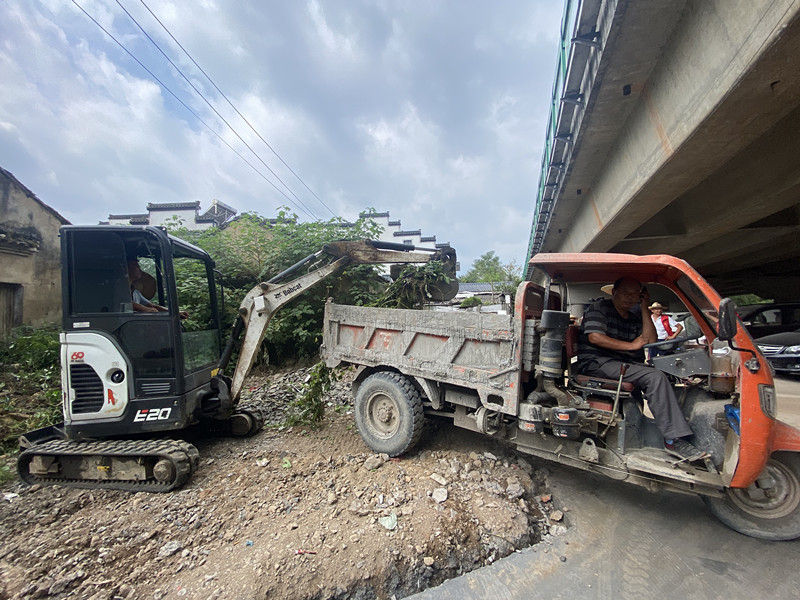 9月20日一大早,在黎陽鎮高梘村高速橋下,鎮、村的志願身穿紅馬甲正在清掃路邊的垃圾,小型挖掘機、運輸車正在清理清運雜草和建築垃圾。