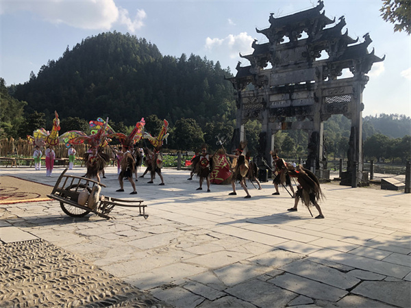 值得一提的是,西遞景區胡文光牌坊廣場的曬秋場景尤其吸睛。隨著鑼鼓聲響起,舞者手持鋼叉,身披蓑衣,祈求風調雨順的黟縣儺舞令人耳目一新。