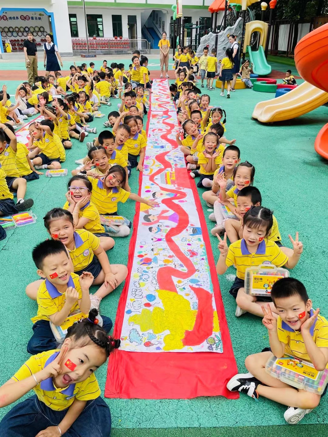 活動現場,小朋友和老師圍坐在畫卷兩邊,用手中的畫筆在長卷上,勾勒描摹出鮮豔的五星紅旗、雄壯的天安門廣場、色彩繽紛的氣球、疾馳的高鐵、七彩的生日蛋糕等元素。以畫傳情、以畫抒志,通過畫筆將心中最美的祖國繪就出來,用藝術的方式表達對黨和祖國的熱愛。