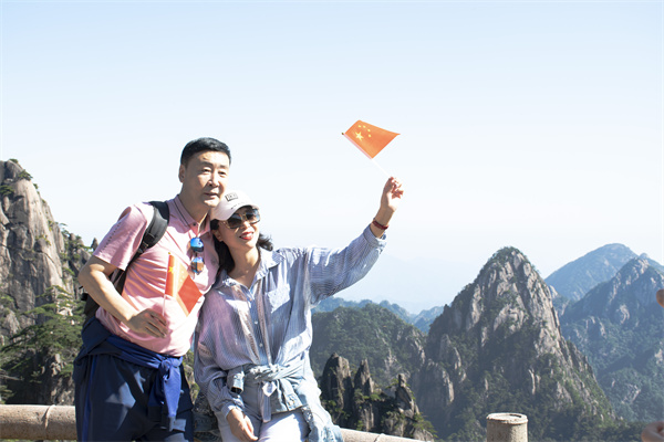 國慶假期第一天,黃山風景區天氣晴朗,白雲飄蕩,青松蒼翠,鮮豔的五星紅旗在黃山之巔迎風招展,景區節日氛圍喜慶濃烈。景區全天接待遊客7340人,交通暢通,旅遊秩序平穩。