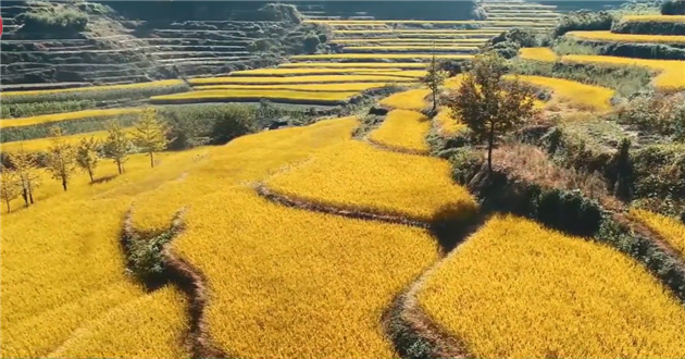 靈山村是有著一個千年曆史的高山村落,梯田面積1200畝。因地理位置高,灌溉水質好,獨特的山間小氣候,孕育出了品質優良的稻米。走進村莊,金燦燦的梯田高低錯落,秋風吹拂下稻浪翻滾,空氣中到處彌漫著稻穀的清香。層層疊疊的梯田、勞作的農民與傳統民居構成了一幅美麗的農耕畫卷。如此美景還吸引了當地電商進行現場抖音直播,助力紅米走出深山,預熱市場。