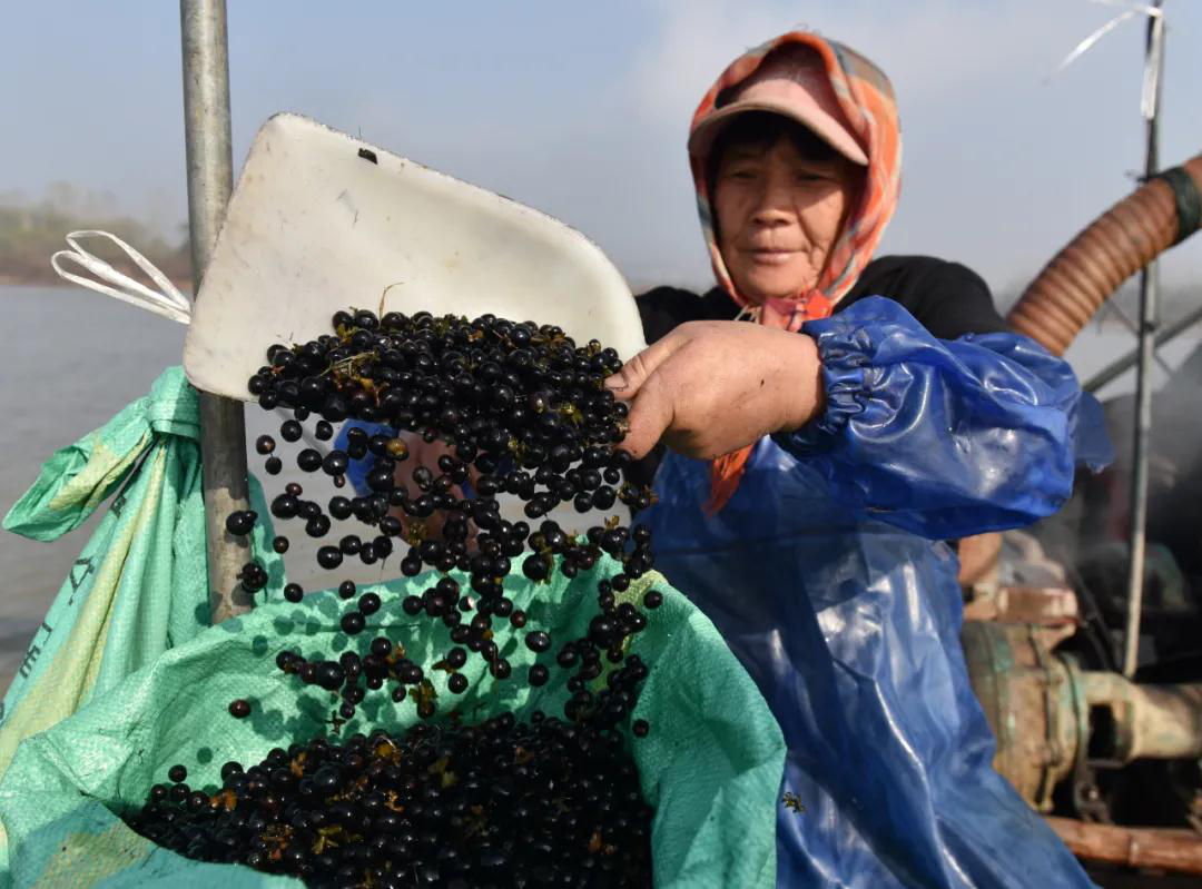 毛尚兵告訴我們,他全部採用芡實採收船進行採收,相比於人工,機械採收能自動過濾掉泥砂和水草等雜物,大大提高芡實果粒打撈的工作效率,降低勞動強度,節省人力物力。他說,11月中旬開始採摘,3條芡實採收船每天能采1.2萬斤左右,預計還有半個月左右全部採收結束。