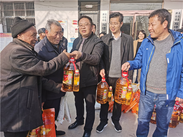 27日下午,支部一行人來到雙樓村,看望慰問了20戶五保戶,並為他們發放了米麵油等慰問品,看着五保戶臉上開心的笑容,黨員們也倍感欣慰。雙樓村駐村第一書記楊可在村部召集民革部分黨員和村部領導以及村裏的生產養殖大戶進行座談。