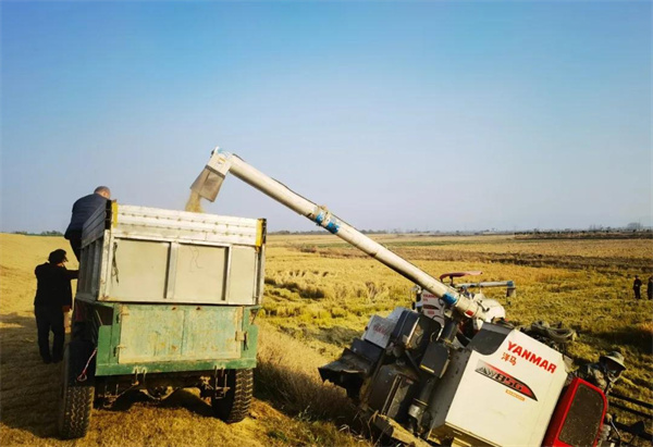 11月29日,在安徽省巢湖市柘皋鎮雙泉村重新整合復墾的200餘畝水稻田中,沉甸甸的谷穗壓彎了腰,兩台大型收割機在水稻田來回穿梭,切割、脫粒、粉碎稻桿,傳送筒伸出,金黃色的穀粒傾斜而下,機聲隆隆,一片繁忙豐收景象。