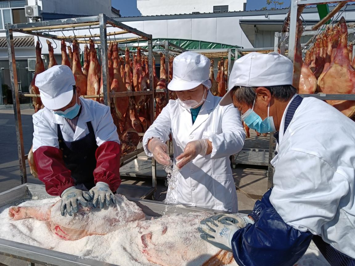 一大早,胡慧娟和家人已經開始忙碌起來,他們正在給精心挑選的新鮮豬腿“推拿按摩”,讓鹽與肉充分融合。“快過年了,家家戶戶都要醃火腿。火腿是我們山裏人必備的一道美食,可以炒辣椒,也可以燉冬笋,非常美味。醃火腿首先用鹽把火腿均勻抹撒一遍,然後放進木桶壓實,醃制40天左右”。徽州火腿要足足曬上三十天的日光浴,才能放到陰涼的地方進行自然發酵,放置半年左右,讓它自然發酵,就可以吃了。趁著晴好天氣,胡慧娟一家將醃制好的火腿拿出進行晾曬,院子被數百只火腿掛滿。陽光下,色澤紅潤、油光發亮的只只火腿,成為一道頗具地方風情的亮麗風景。