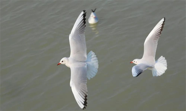 紅嘴鷗,俗稱「水鴿子」,體形和毛色都與鴿子相似,嘴和腳皆呈紅色,身體大部分的羽毛是白色,尾羽黑色。其數量大,喜集群,在許多沿海港口、湖泊都可看到。一般生活在江河、湖泊、水庫、海灣。主食魚、蝦、昆蟲及水生植物。(何勝忠 龔舒斌)