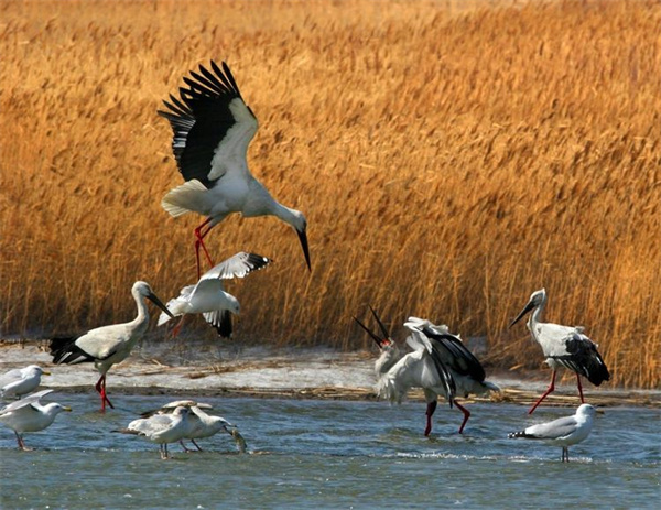 遼寧省盤錦市擁有大面積的蘆葦盪,這裏是丹頂鶴遷徙通道中的一個重要停歇地。在遼寧鶴類種源繁育基地可近距離接觸了生長在這裏的「濕地精靈」丹頂鶴。這裏每年有上萬隻水鳥停歇、棲息,並成為丹頂鶴、灰鶴等國家重點保護鳥類的越冬或停歇場所,是保護區內停歇丹頂鶴最大種群的棲息地,最多時達500餘只。(孫俊程 王藝橋)