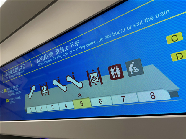 此外,該條線路還運用嵌入式的站台顯示系統,站台顯示屏直接嵌入到屏蔽門上,PIDS系統通過視頻方式為乘客提供:快慢車、當前站、下一站、終點站、車廂擁擠度、當前候車位置等多方位資訊信息,為乘客提供清晰的信息指引。