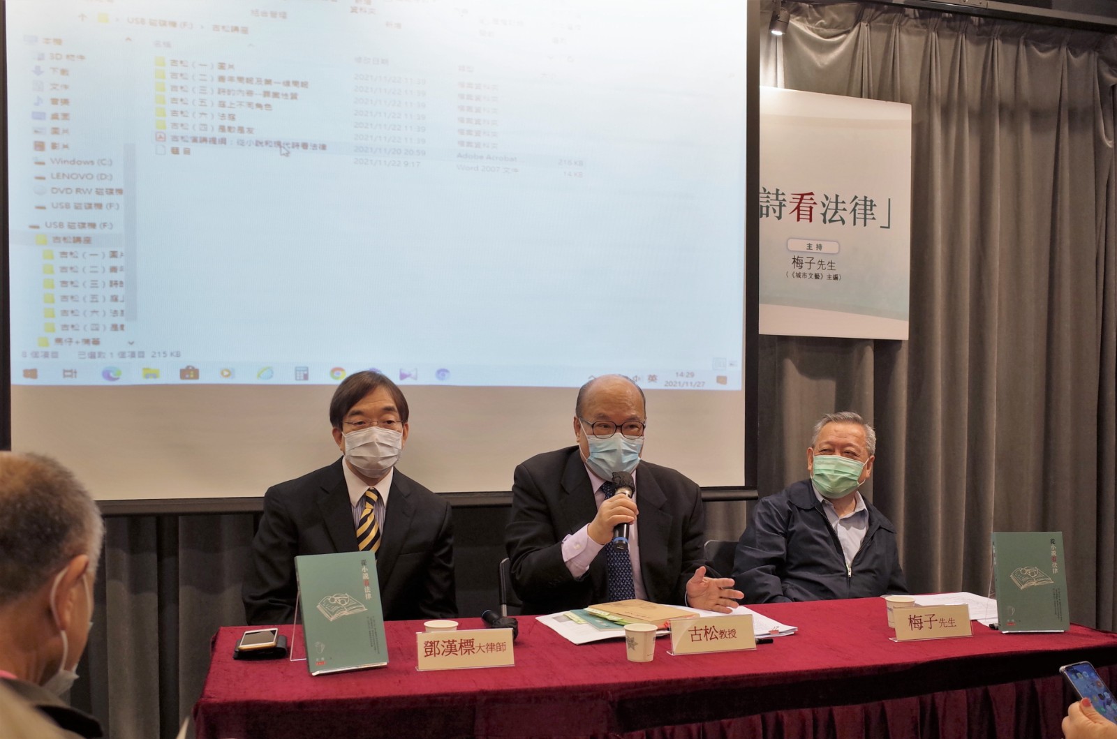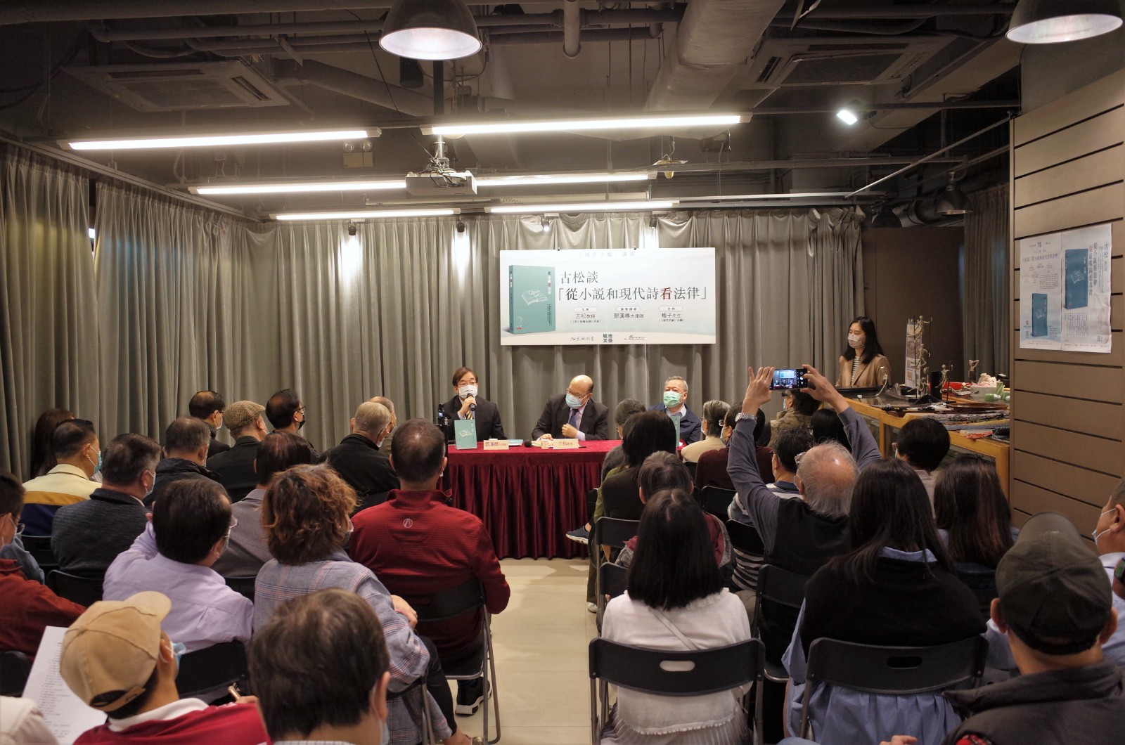 2006年開始,古松將閱讀中外小說時思考的法律問題,寫成系列文章陸續發表,其中一部分於2011年結為專書《法律與文學》,備受愛書人士關注,2020年出版的《從小說看法律》是其續編。在「從小說和現代詩看法律」講座中他分享不少書內例子:「內地也有涉及法律的小說,如《秋菊打官司》、《包公奇案》等,《紅樓夢》賈寶玉與薛寶釵結婚,究竟這樣的婚姻是否合法。西方小說蘇聯德羅茲特的《女法官與男囚犯》探討法官的持平態度、東野圭吾的《彷徨之刃》探討法律是幫助好人抑或壞人等。」古松直至現在也持續研究文學與法律,並將文章發表在《城市文藝》,希望幫助讀者認識法治。 (記者、攝影:Janice)