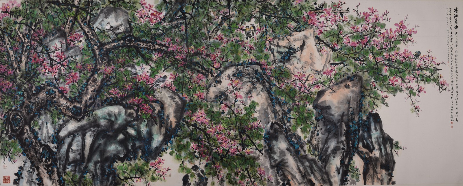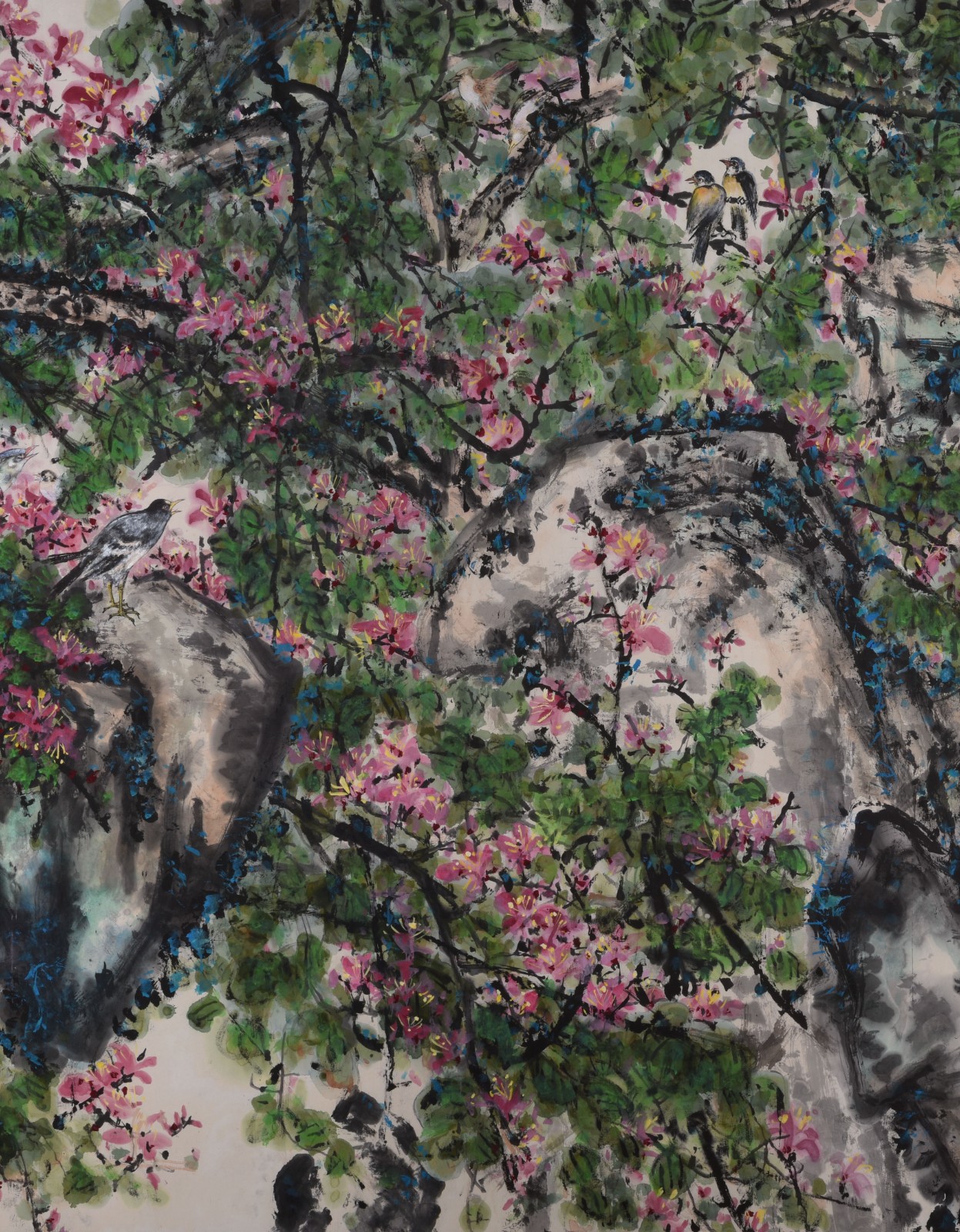 蕭教授的畫飽含熱情,如同他對祖國的滿腔熱忱一般濃烈。畫中紫荊花迎春怒放,欣欣向榮,構圖盈滿而不呆板,色彩絢麗而不妖俗,煥發著蓬勃的生機。其作品包涵了中國畫的底蘊和修養,在傳統書畫的學習上功底深厚,他以書法入筆,力透紙背,蒼勁又不失靈氣;同時又具有鮮明的地域特點和個人風格,嶺南地區溫暖濕潤,花草豐茂,四季不乏明豔的色彩,而香港的中西方文化又碰撞出了令人耳目一新的繪畫技巧。蕭教授的畫中能看到如同油畫般的筆觸和厚重肌理,兩種截然不同的繪畫系統在他的作品中巧妙地結合起來,在水墨畫的創新上達到了更高的境界。