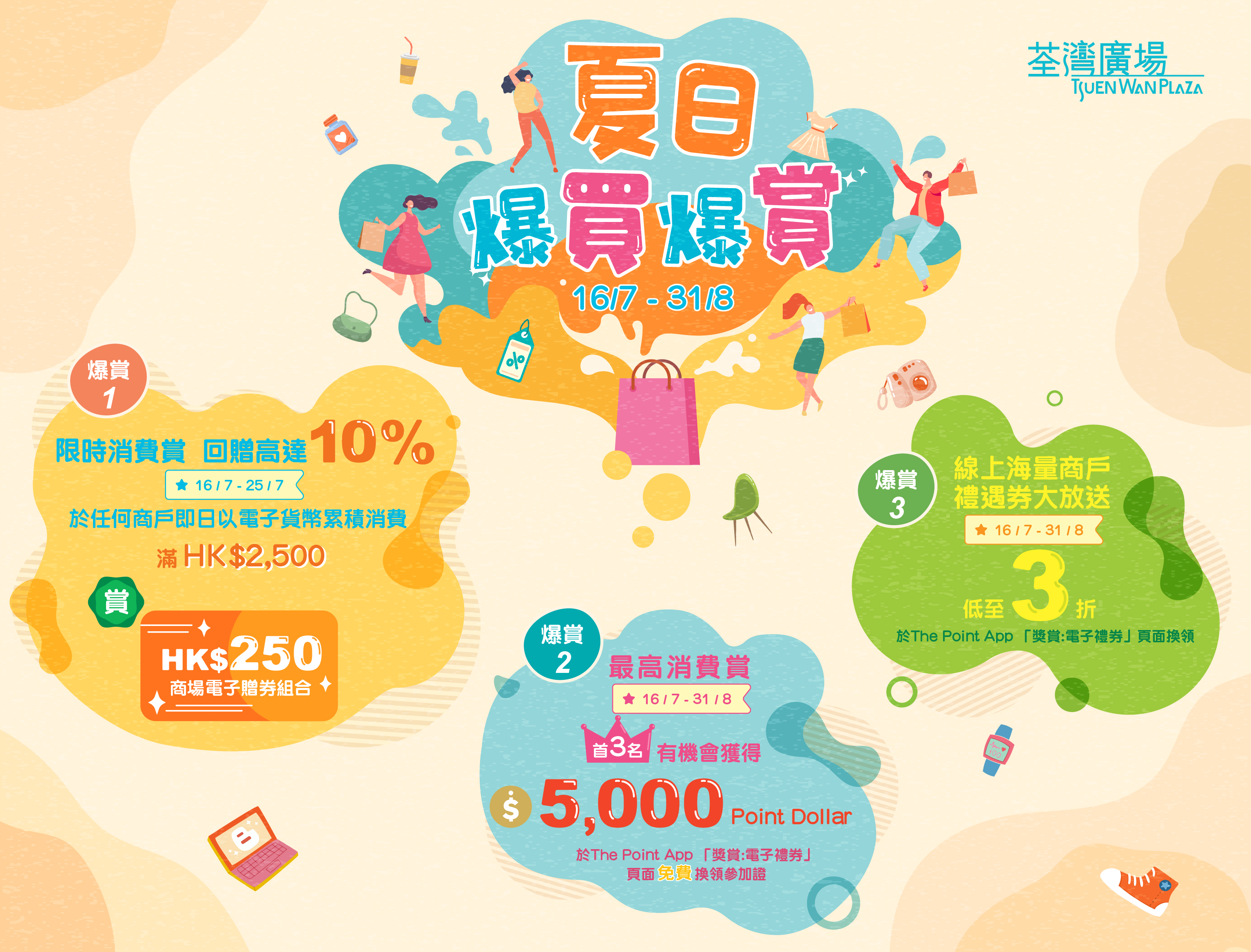 荃灣廣場推出「夏日爆買爆賞 」三重消費獎賞,由7月16日至7月25日,於任何商戶即日以電子貨幣消費滿HK$2500,即賞HK$250商場電子贈券組合。由7月16日至8月31日,會員於The Point App「獎賞:電子禮券」頁面能換領低至三折的商戶禮遇券,以及換領參加證,消費最高首3名顧客,有機會獲得5000 Point Dollar。