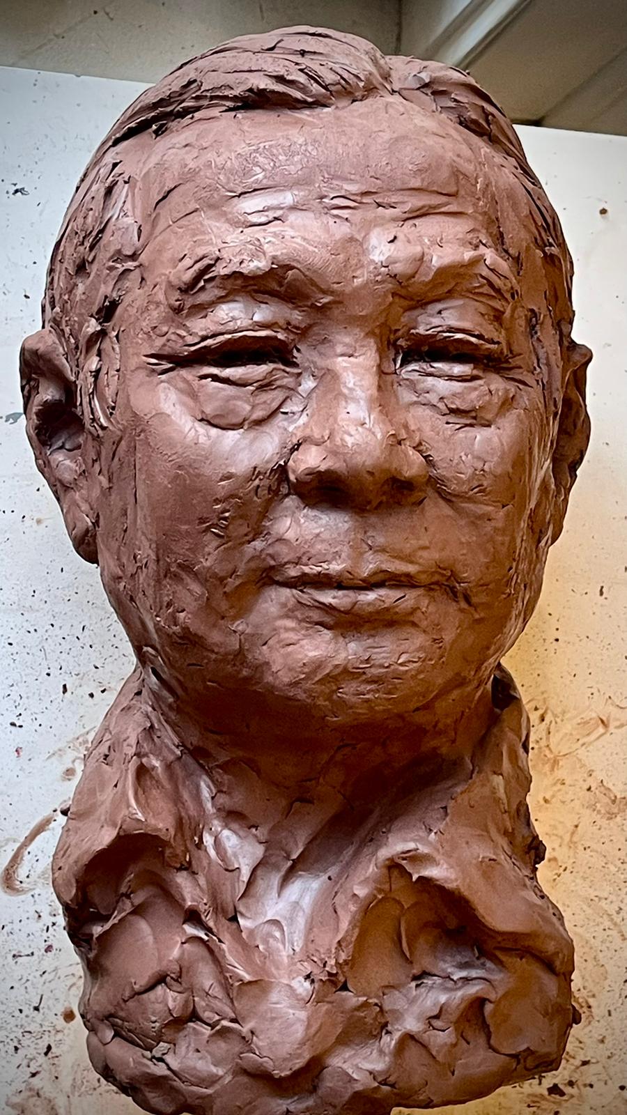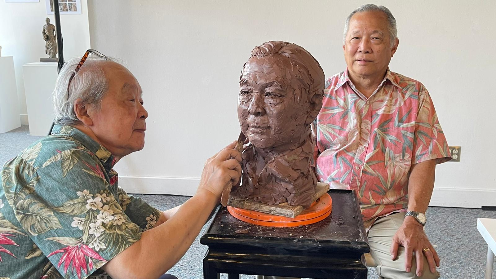 朱達誠(左)在展覽現場進行人像雕塑示範,為孫中山的曾孫孫國雄(右)塑造頭像。