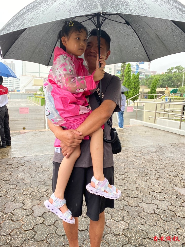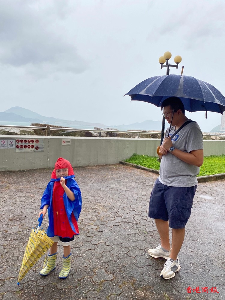 住在杏花邨的陳先生穿上拖鞋、撐着大雨傘,與7歲女兒一起站在海邊看海。