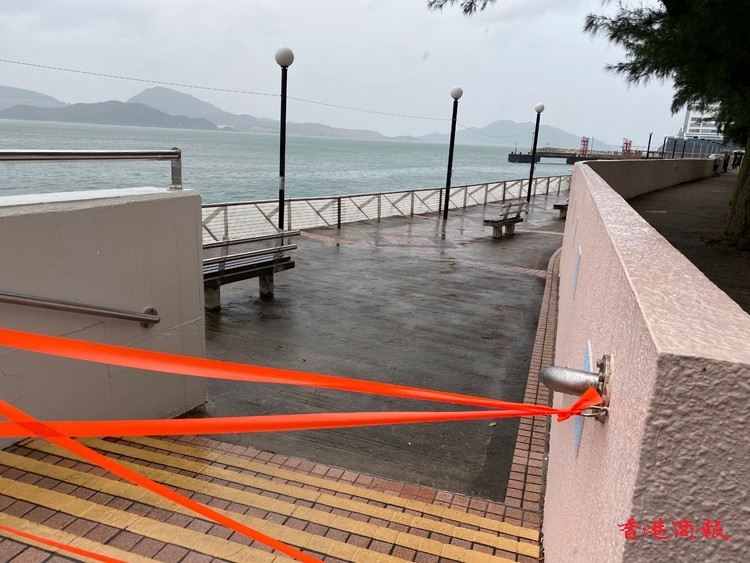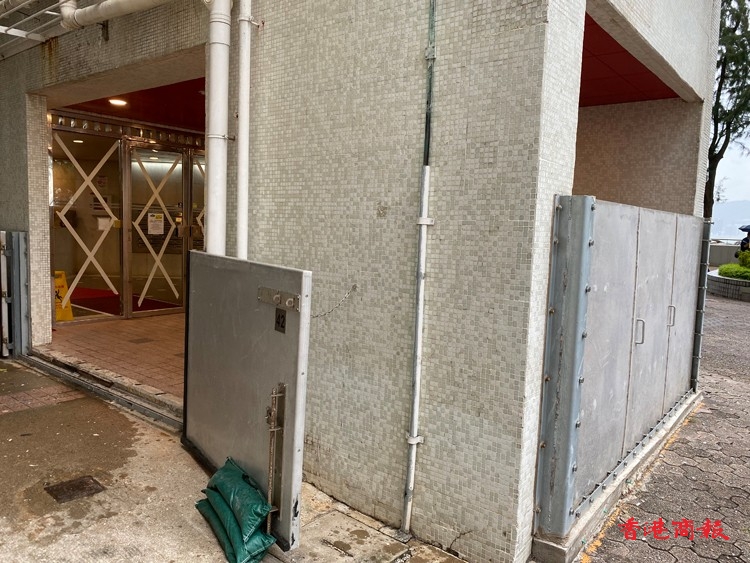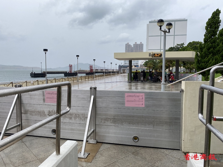 杏花邨昨天已為颱風吹襲作好準備,商場、大廈出入口已裝上擋水閘,露天停車位亦不見有車輛停泊,康文署亦在海旁公園最近海邊的長椅位置拉上警戒線,不讓市民進入。