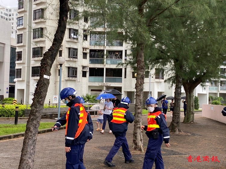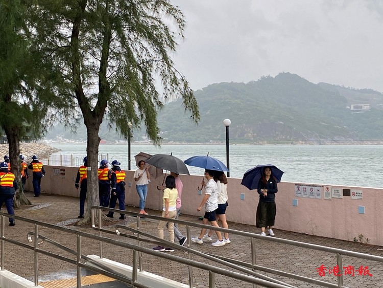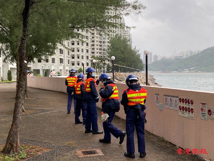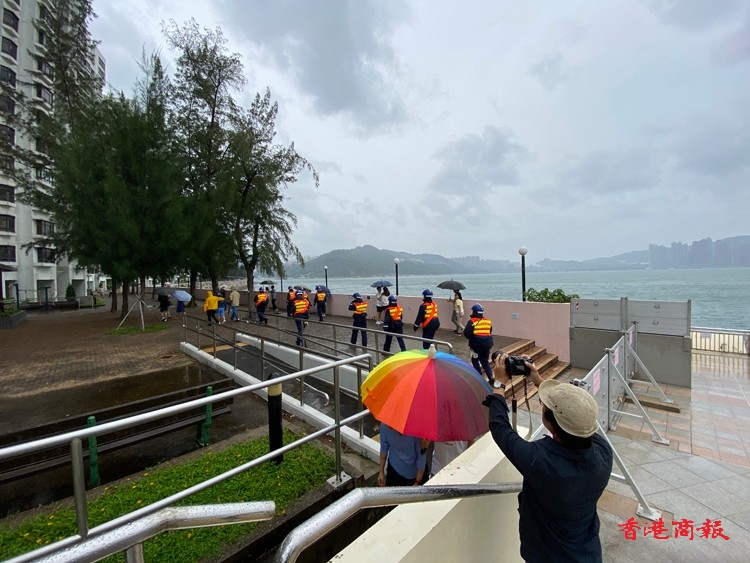 海旁有10多名民安隊人員不斷用揚聲器勸籲市民離開,市民打完卡後便散去,但隨即有另一批市民來到,每批約10多、20人。民安隊背上全副裝備、身上背有救生繩索、緊急救護箱,在海旁來回巡邏。隊長現場訓示隊員要留意每棵樹木有否裂痕和響聲,察看大廈窗戶有否搖搖欲墜。