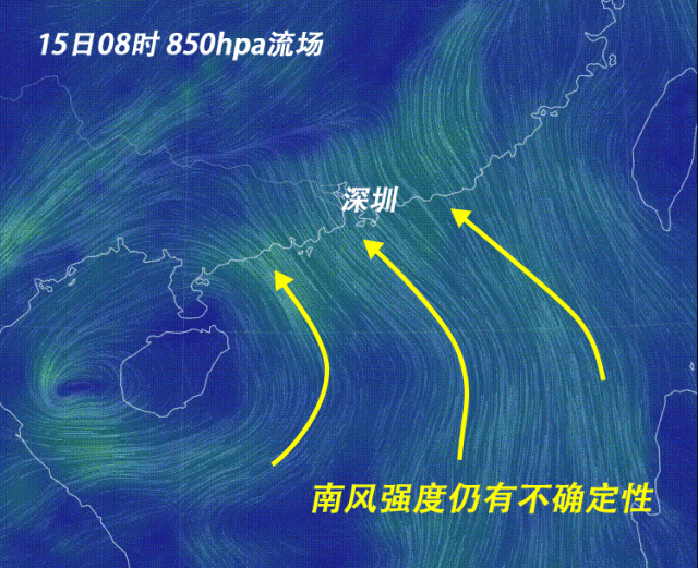 由於未來2-3天南風的強度存在較大不確定性,南風的強弱程度將影響本次降雨的落區和量級,請持續關注深圳天氣發布的最新預報信息。