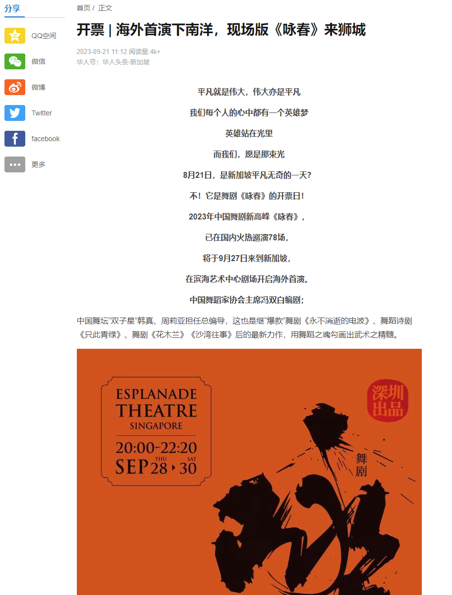 日前,新加坡華文綜合性日報《聯合早報》刊發整版文章《中國舞劇〈詠春〉貫穿現代與傳統》,聚焦《詠春》並深度剖析《詠春》之妙。與此同時,在海外社交媒體平台上,越來越多的博主陸續發布《詠春》圖、文、視頻,表達對《詠春》新加坡之行的期待。《詠春》演出單位深圳歌劇舞劇院也開設了社交賬號,官宣「詠春新加坡演出」即將啟幕。《Shenzhen daily》《香港商報》等在海外社交媒體平台開設的賬號亦「火力全開」。《詠春》獅城輿論聲浪漸起,期盼着《詠春》掀起蓋頭來。