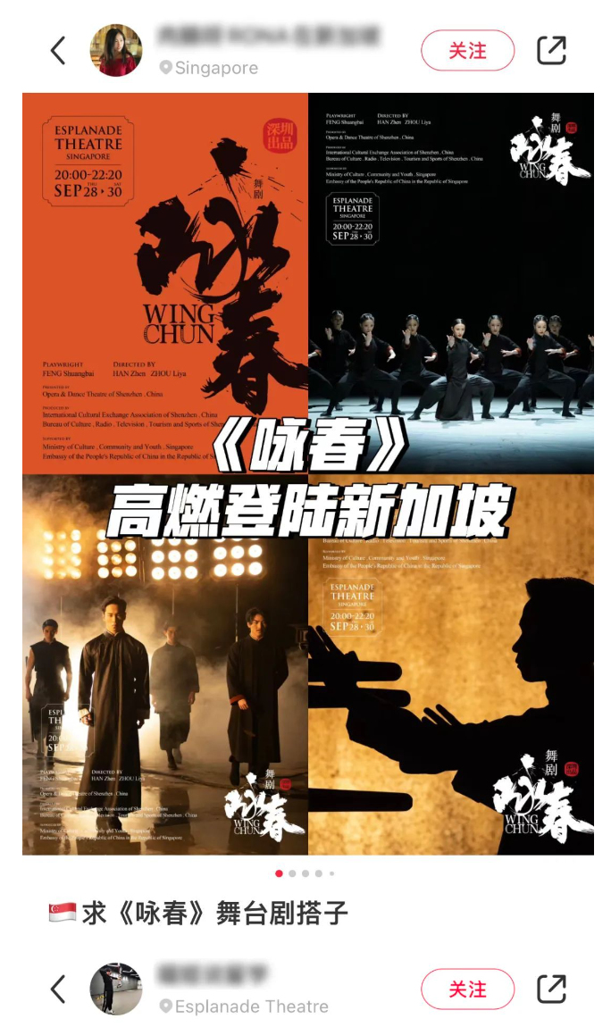 小紅書平台也聚集了不少海外華人用戶。記者注意到,許多新加坡社交媒體賬號如「新加坡研究所」「新加坡去哪兒嗨」「新加坡美食攻略」「極目所見新加坡」「新加坡痣」等以及官方機構「新加坡中國文化中心」等都紛紛發布筆記,為舞劇《詠春》搖旗吶喊。