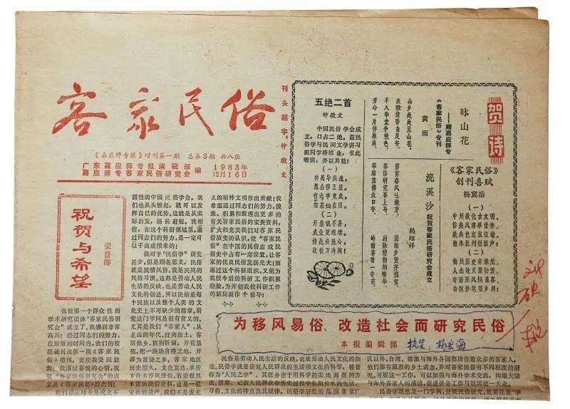 1983年12月16日,《客家民俗》作為《嘉應師專報》的增刊創刊。被譽為「中國民俗學之父」的鐘敬文教授,不僅題寫了刊頭書法,還在「報眼」顯要位置刊發了他的《五絕二首》。