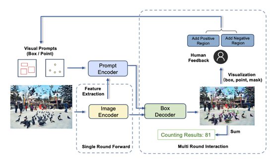 團隊透露,研發視覺提示技術是源自對真實場景中痛點的觀察。有合作方希望利用視覺模型對卡車上的貨物數量進行統計,然而,僅通過文字提示,模型無法單獨識別出每一個貨物。其原因是工業場景中的物體在日常生活中較為罕見,難以用語言描述。在此情況下,視覺提示顯然是更高效的方法。與此同時,直觀的視覺反饋與強交互性,也有助於提升檢測的效率與精準度。