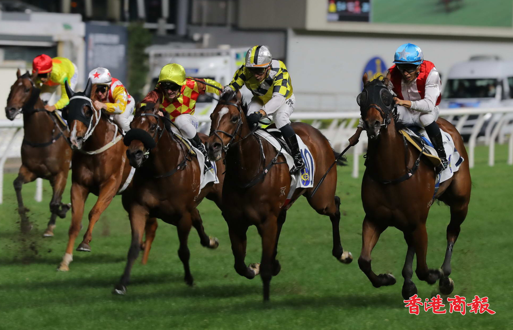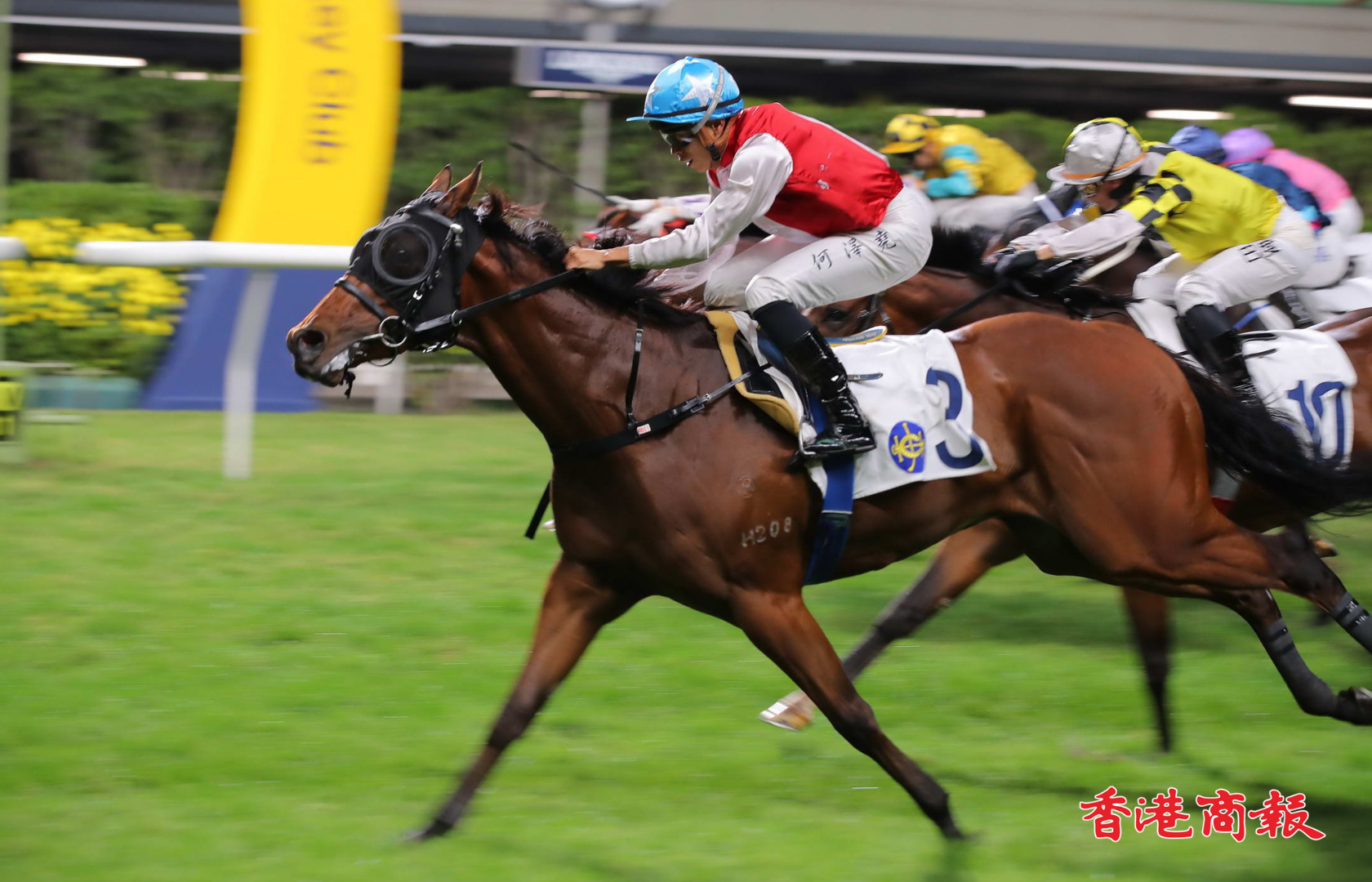 周三晚(22日)跑馬地馬場舉行8場賽事,四場四班1000米,黎昭昇訓練的「萬眾開心」在何澤堯胯下,直路大外檔衝刺後上取勝,繼今年5月3日勝出四班谷草1200米後,再次勇奪勝仗。此駒為萬眾一心團體馬,譚詠麟(譚校長)正是馬主之一,「萬眾開心」衝線一刻,譚校長開心大叫,並且高舉V字手勢,相當興奮。