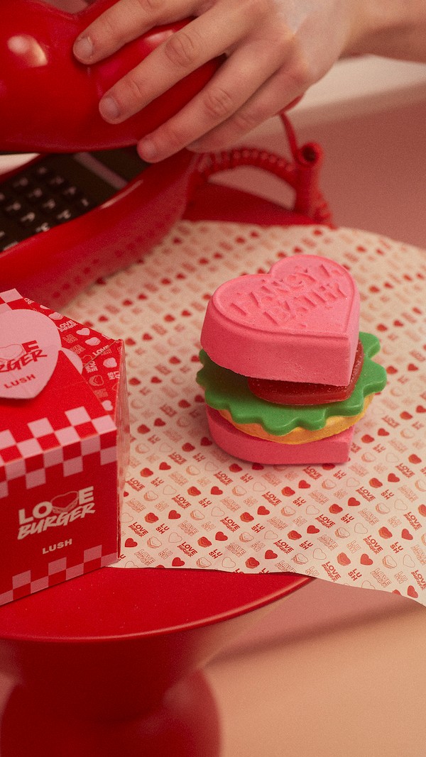 全新愛情漢堡沐浴組合包含三款產品:頂部的心形泡泡浴彈散發櫻桃香氣,中間是帶有酸甜番茄和生菜香氣的香皂,底部則是果香泡泡浴芭。沐浴組合中的心形番茄香皂採用新鮮番茄製成,新鮮番茄具有清潔肌膚的作用,同時有助於降低體溫和消除異味。全新浪漫情書泡泡浴彈結合了滋潤皮膚的可可脂和椰奶,具有保濕效果,並散發着草莓和輕柔的純素奶油香氣。