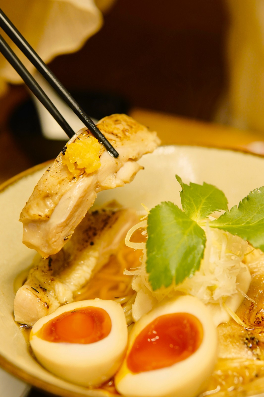 肉食愛好者可選擇「雞醬油拉麵」,湯底採用日本產雞和醬油及味醂醃製的新鮮花蛤及蛤蜊,取其鮮香味美,拉麵特別之處在於搭配了三款叉燒,包括「柚子雞叉燒」以柚子皮醃製阿波尾雞胸肉,口感清新;「香草火炙雞叉燒」阿波尾雞腿肉以日本岩鹽、胡椒、百里香、芹菜和大蒜醃製,雞肉保留雞皮以火炙燒,肉質香嫩多汁;「火炙北海道十勝豚肉」,梅頭肉以雞貝鹽及雞醬油醃製,為拉麵注入豐盛滋味。 (記者、部分圖片:Janice)