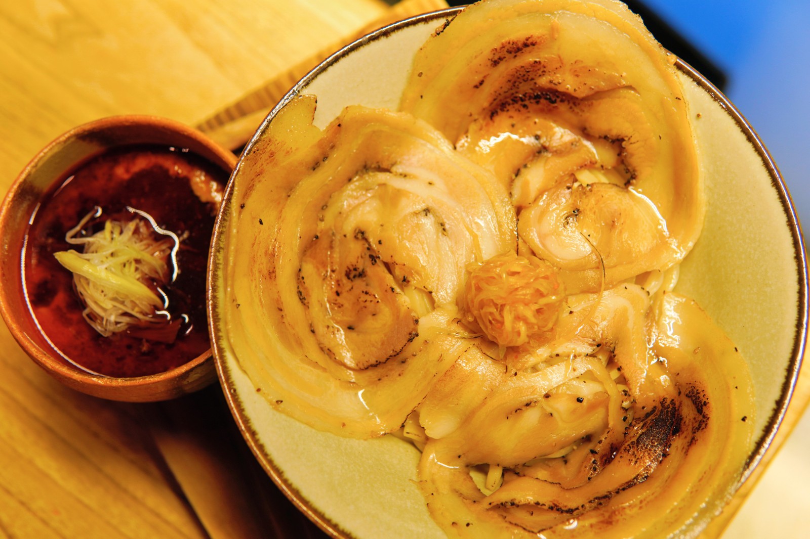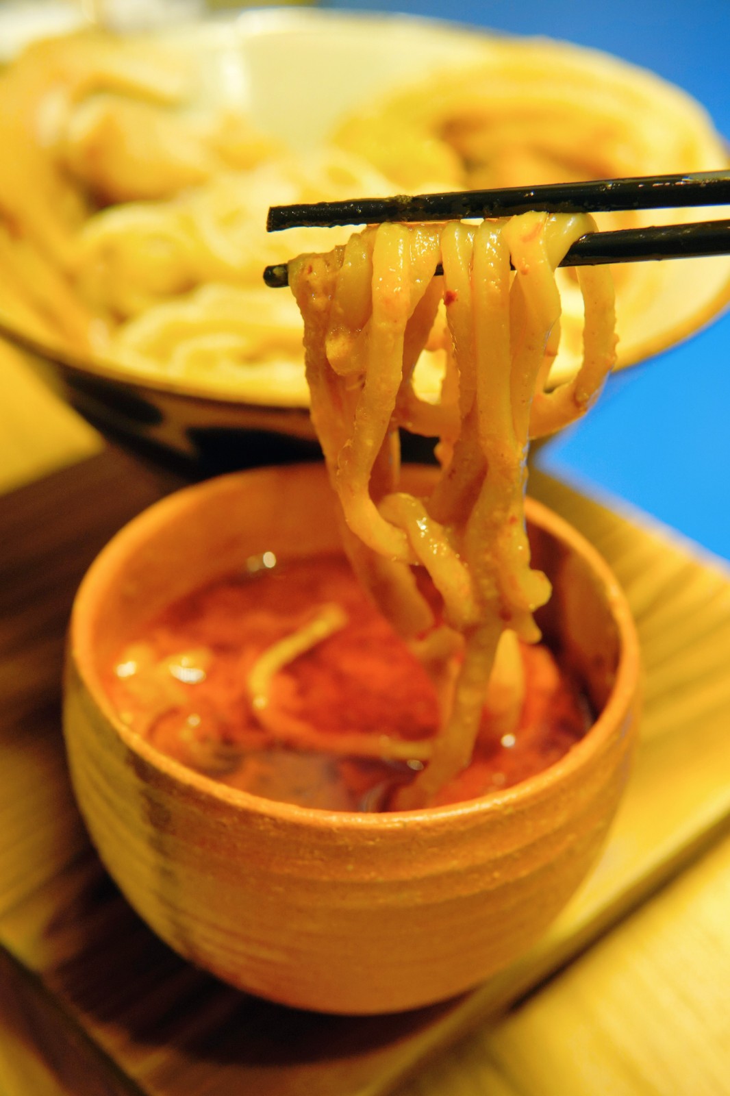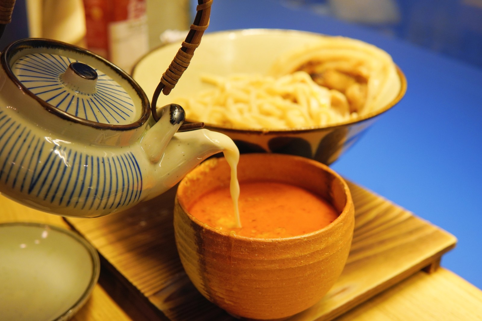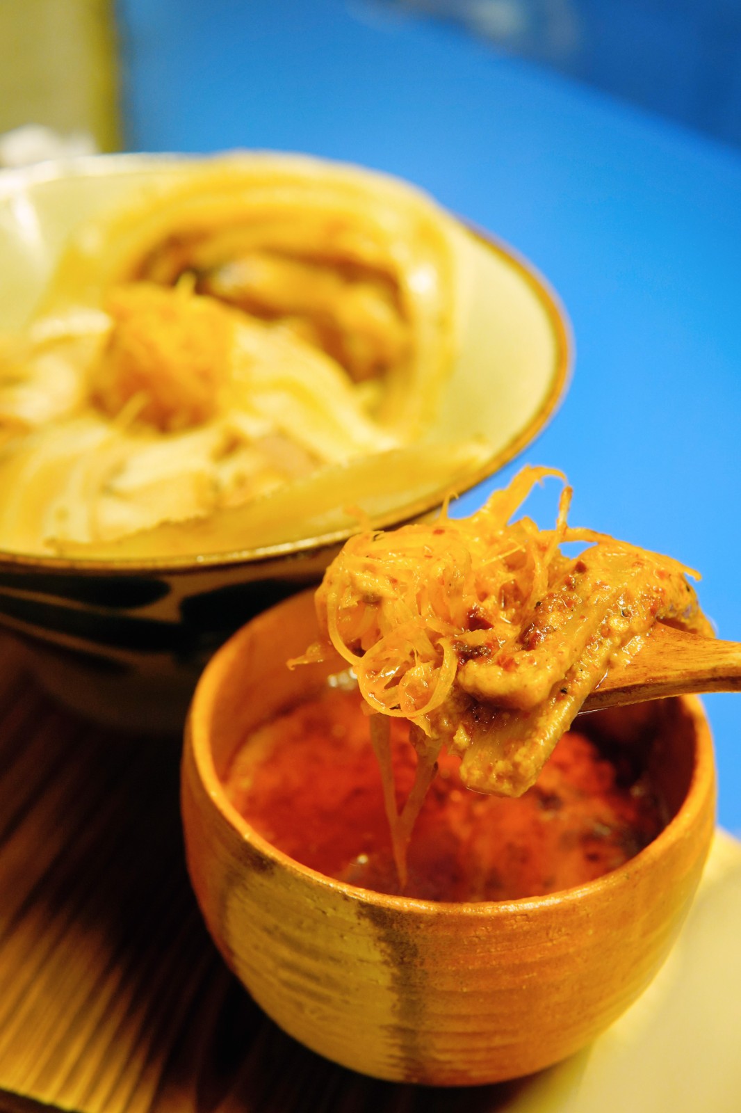 嗜辣者推介「火炙豚肉擔擔沾麵」,粗麵條選用日本小麥粉製作,濃郁的雞白湯與芝麻味噌醬熬製而成的沾麵醬汁相結合,風味獨特。芝麻味噌醬的芝麻經輕微烘焙、多次磨碎,展現香氣和順滑口感,同時用上京都、德島及信州多地味噌,調配出複雜有致的味噌。沾麵搭配3片火炙豚肉叉燒,以北海道十勝豚梅頭肉經低溫焗製四小時而成,脂肪比例均勻、肉質鮮嫩,加入甜辣京蔥作點綴。把麵吃完後,剩下的沾湯可加上豆乳製成「湯割」享用,以沾湯、豆乳約一比一的比例混合,充分品味稀釋後的湯底滋味。