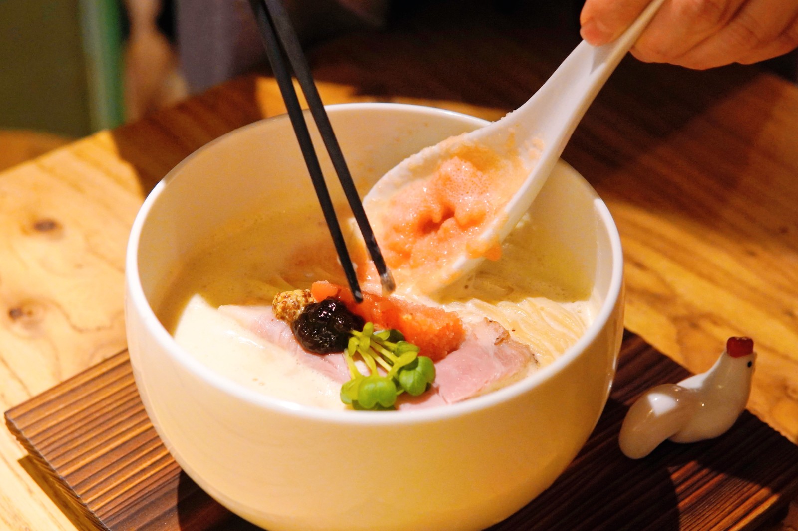 「明太子豆乳雞白湯拉麵」,HK$158。湯底來自京都的丹波地雞熬製而成,綴以松露油,配料包括北海道十勝豚肉、博多明太子及岩海藻和芥末粒。