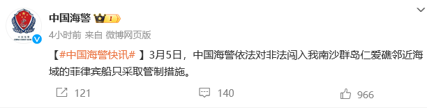 中國海警局5日消息,中國海警當天依法對非法闖入中國南沙群島仁愛礁鄰近海域的菲律賓船隻採取管制措施。
