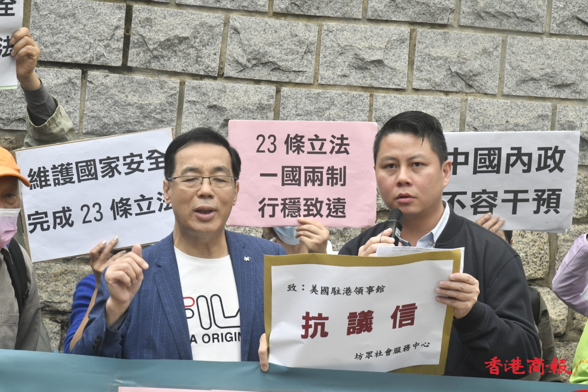 一眾香港市民和坊眾社會服務中心今日(5日)分別前往美國駐港澳總領事館請願。到場市民稱,作為香港人對美國政客抹黑23條立法強烈不滿和堅決反對,更對23條立法表示支持及歡迎。23條立法充分體現香港人權、自由、法治,維護國家安全是港人義務與責任,只有國家安全,香港才能心無旁騖,集中精力發展經濟、改善民生。