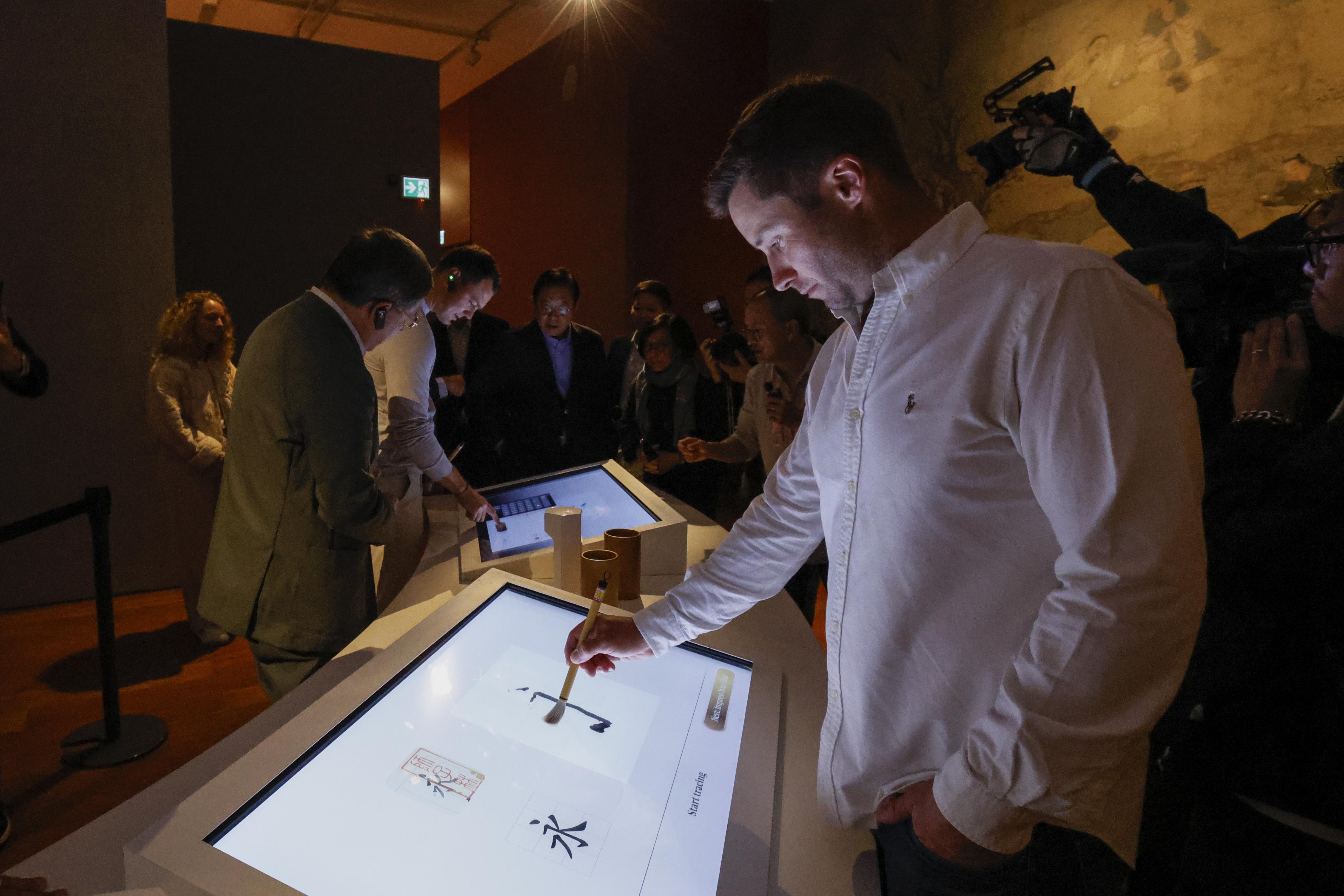 球星用館內的互動展品試寫毛筆字,並對中文字甚感興趣。