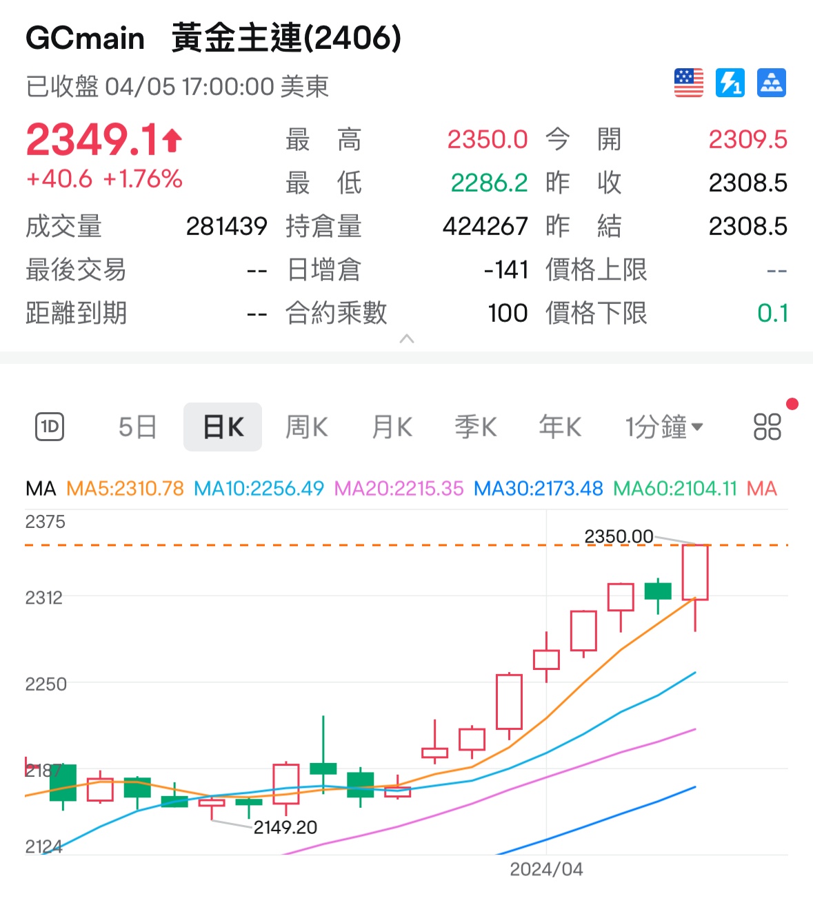 儘管美國勞工部周五發布的3月非農就業人數「爆表」、市場認為聯儲局降息預期或延後,但國際金價昨日(5日)完全無視這個利空因素,在本周最後一個交易日,金價延續近段時間以來節節攀升的態勢,並再度創下歷史收盤新高。昨日,現貨黃金向上觸及2330美元/盎司關口,日內漲超1.6%,並收於此關口附近。COMEX 6月黃金期貨收漲1.60%,報2345.40美元/盎司,再創歷史收盤新高。COMEX 5月白銀期貨收漲0.94%,報27.503美元/盎司。