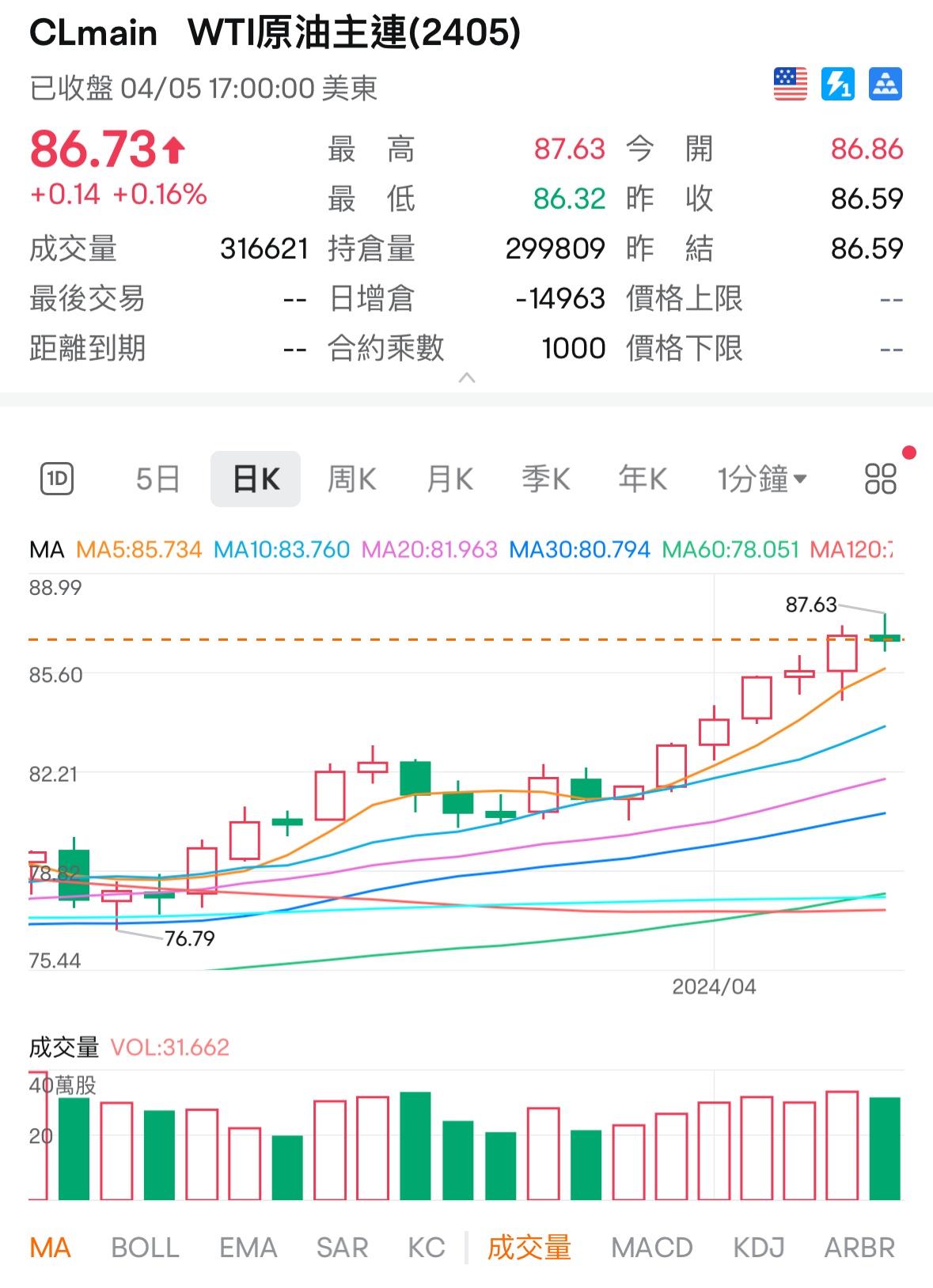WTI 5月原油期貨日K圖(富途牛牛APP截圖)