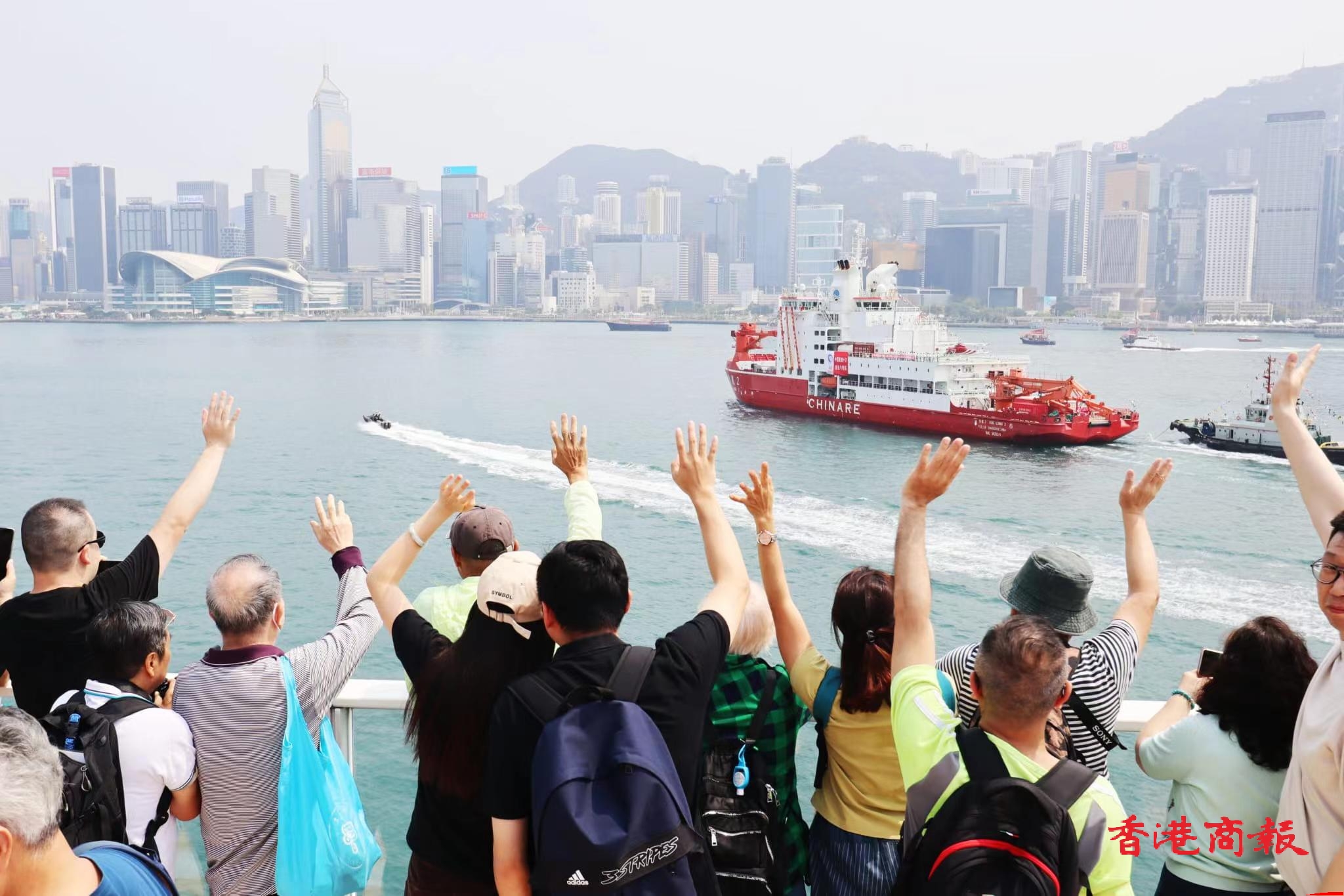 尖沙咀海運大廈碼頭平台有近半百市民、遊客揮手歡送「雪龍2」號。