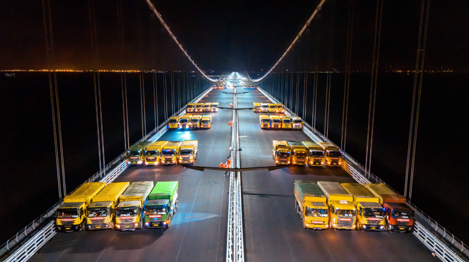 在動載無障礙行車試驗中,工程師安排兩輛滿載共70噸、相當於約45輛小汽車重量的載重卡車,以每小時10至60公里不等的時速在大橋上勻速行駛。通過傳感器,工程師測試結構在行車荷載作用下的動力反應,分析得到橋樑的衝擊系數。