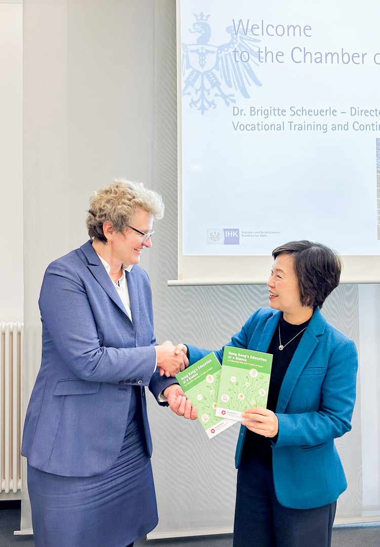 同日下午,蔡若蓮與法蘭克福工商總會職業訓練及持續進修總監Brigitte Scheuerle會面,了解總會作為德國最大的工商會之一,如何推動職專和相關的教育工作。