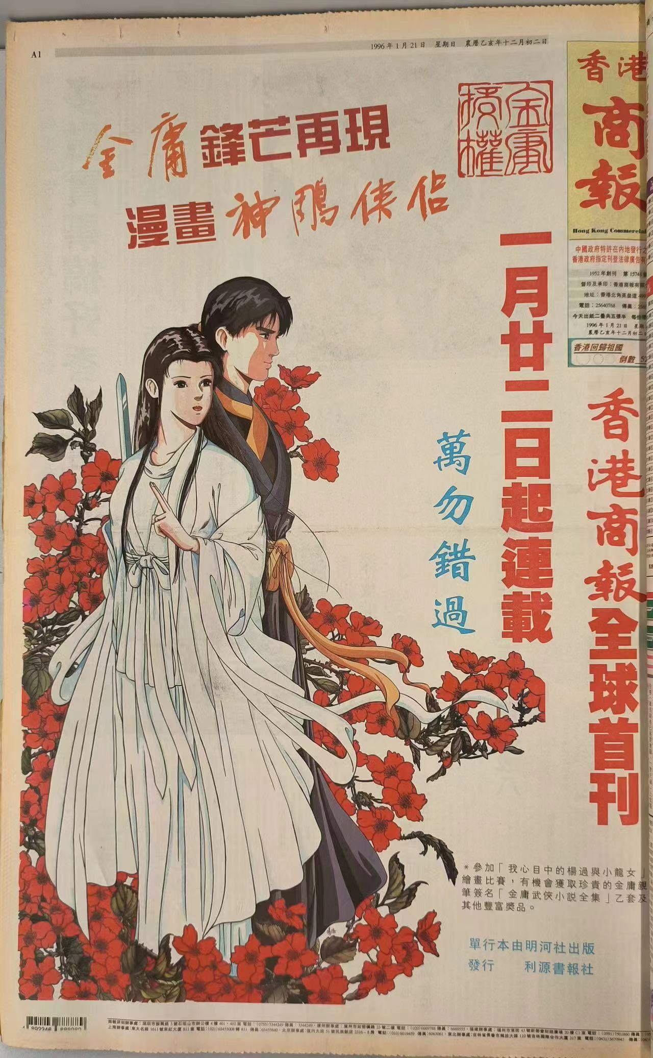 王軍介紹,金庸的第二部武俠小說——《碧血劍》1956年在香港商報連載了一年。《射鵰英雄傳》是金庸的高峰之作,1957年在《香港商報》開始連載,連載了兩年半的時間,令香港商報銷量大火,洛陽紙貴。同時正由於小說熱銷,也令金庸先生萌生了創辦報紙的想法,並於1959年創辦了《明報》。金庸先生生前長期擔任香港商報顧問,與香港商報關係密切。在香港商報創辦45周年之際,還專門題寫寄語——「報壇舊侶 歷久彌新 越戰越勇 愈編愈精」。正是鑑於金庸與《香港商報》淵源流長歷史,香港商報也是在活化這段歷史持續下功夫,並努力數碼化展示這段歷史。