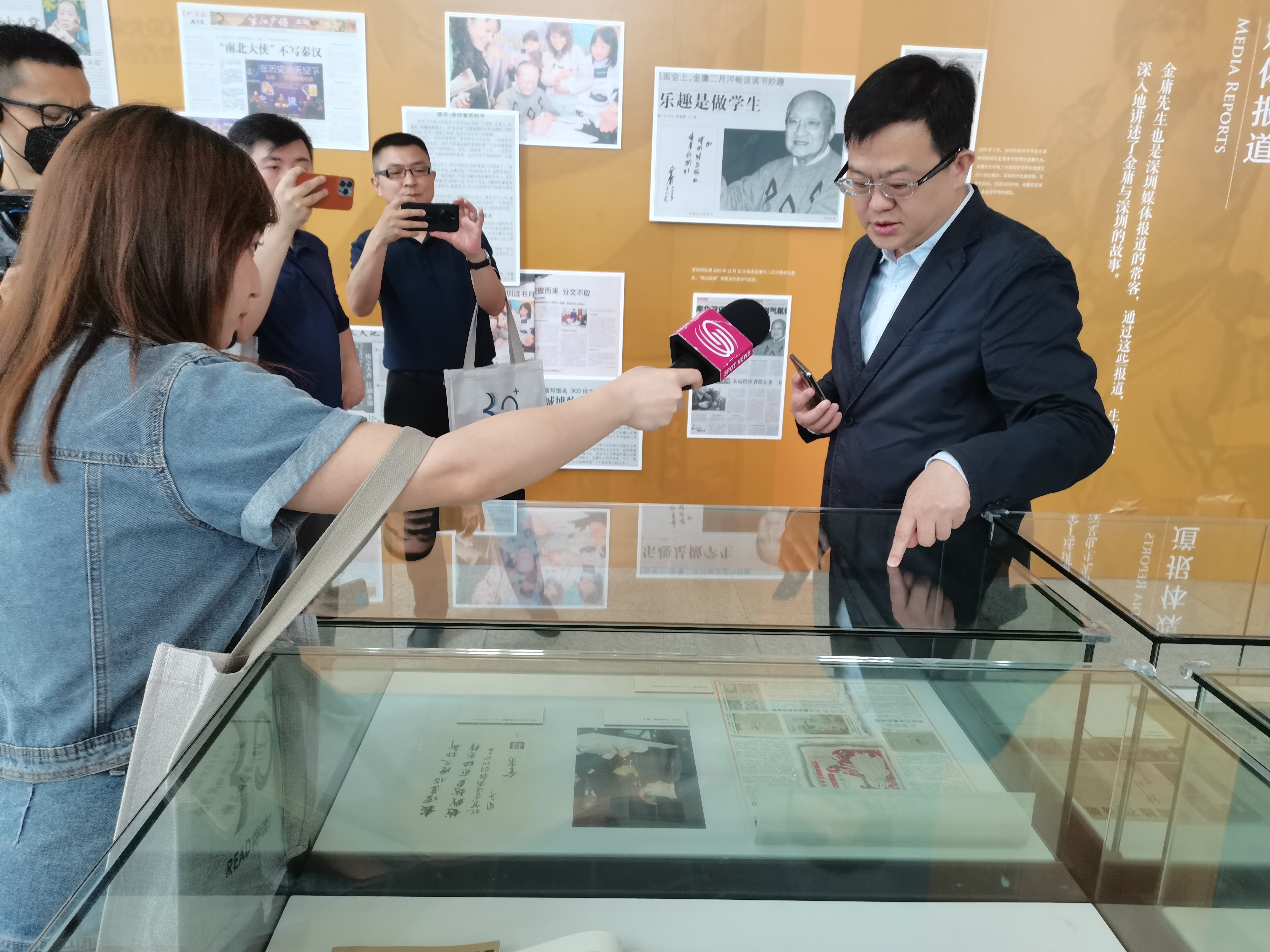 23日在深圳圖書館揭幕的「紀念金庸先生百年誕辰主題文獻展」,香港商報為該展提供的多份珍貴報樣,吸引市民駐足觀看。