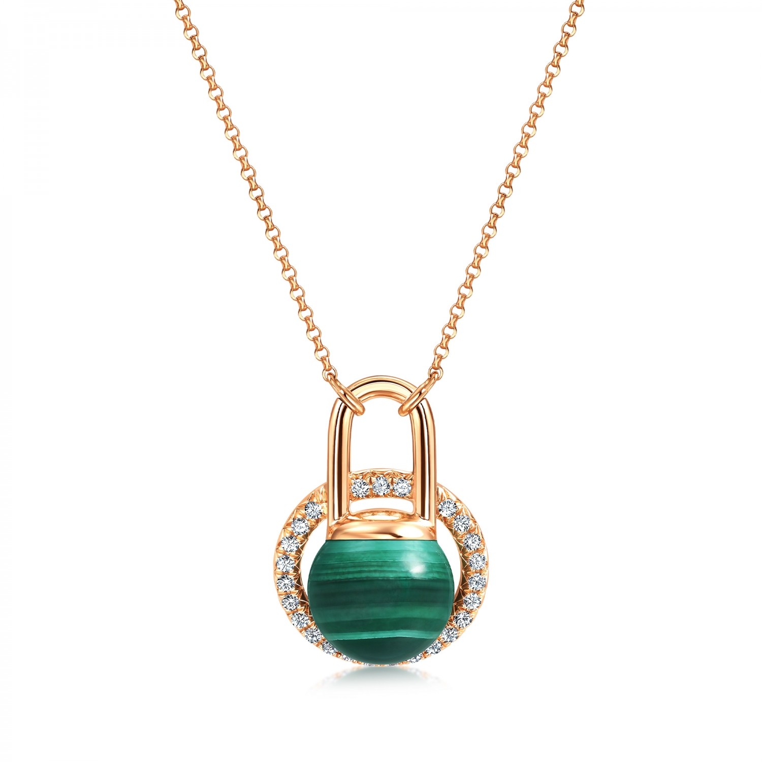 孔雀石吊墜頸鏈採用18K玫瑰金鎖頭連結,孔雀石的光澤和美鑽互相輝映。