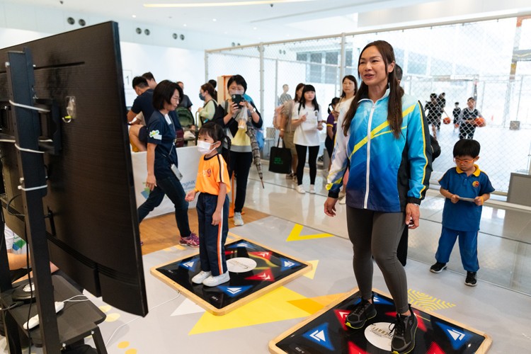李慧詩試玩跳舞機,與小朋友打成一片。
