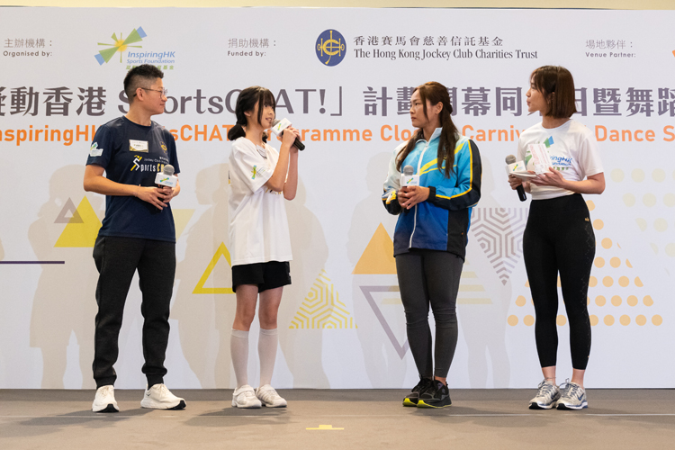 香港賽馬會慈善信託基金捐助,凝動香港體育基金主辦的「賽馬會凝動香港 SportsCHAT!」今日(4日)舉行閉幕典禮,並邀請到兩屆奧運場地單車銅牌得主李慧詩暢談運動經歷,同時舉行SportsCHAT!學員舞蹈匯演及多個運動跳戰站和攤位,吸引近500名市民參與。