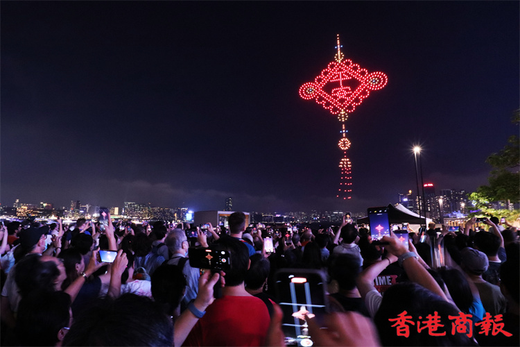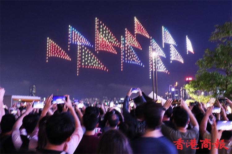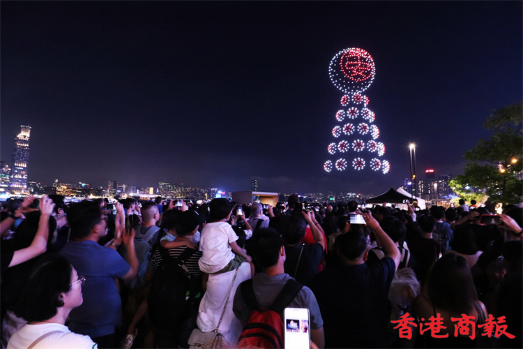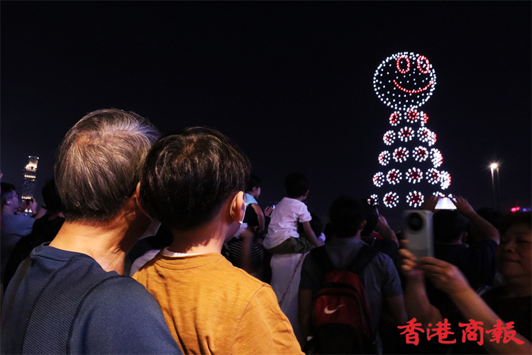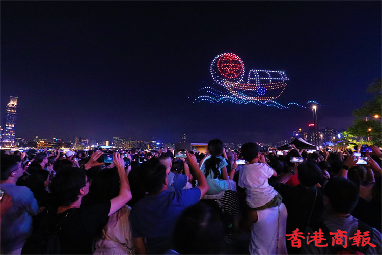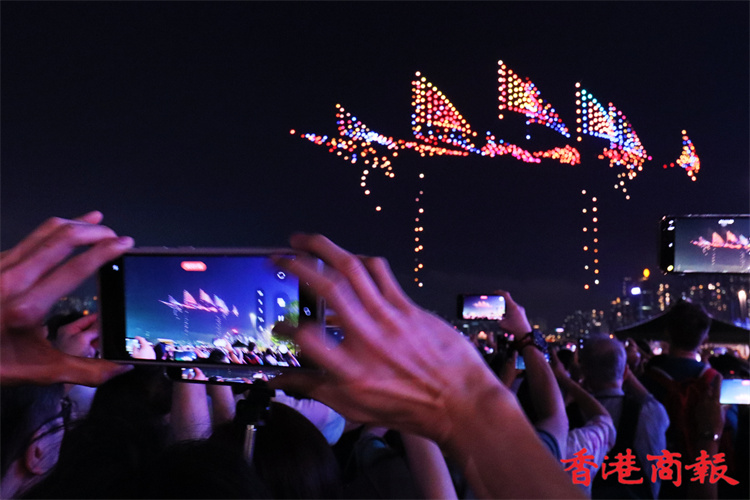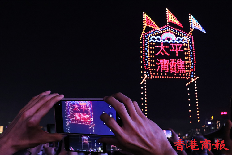 灣仔海濱對出海面今晚8時上演旅發局舉行的首場定期無人機表演,長約10分鐘。為配合下星期來臨的佛誕及太平清醮,表演以這兩大節慶為設計重點,推廣傳統特色,由1000架無人機於維港上空約90米,以不同動態陣列展現特色圖案,包括巨大平安包、大包山、太平清醮花牌、醒獅、平安結等。表演期間,現場將同步播放表演音效。(馮瀚文攝)