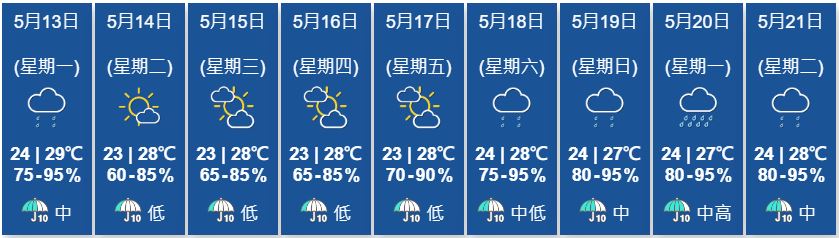 此外,明日(13日)仍有幾陣驟雨,一股較乾燥的偏東氣流會在明日稍後抵達廣東沿岸,隨後數天短暫時間有陽光,風勢較大。預料偏東氣流會在下周初逐漸被不穩定的偏南氣流取代,該區驟雨增多及有幾陣雷暴。