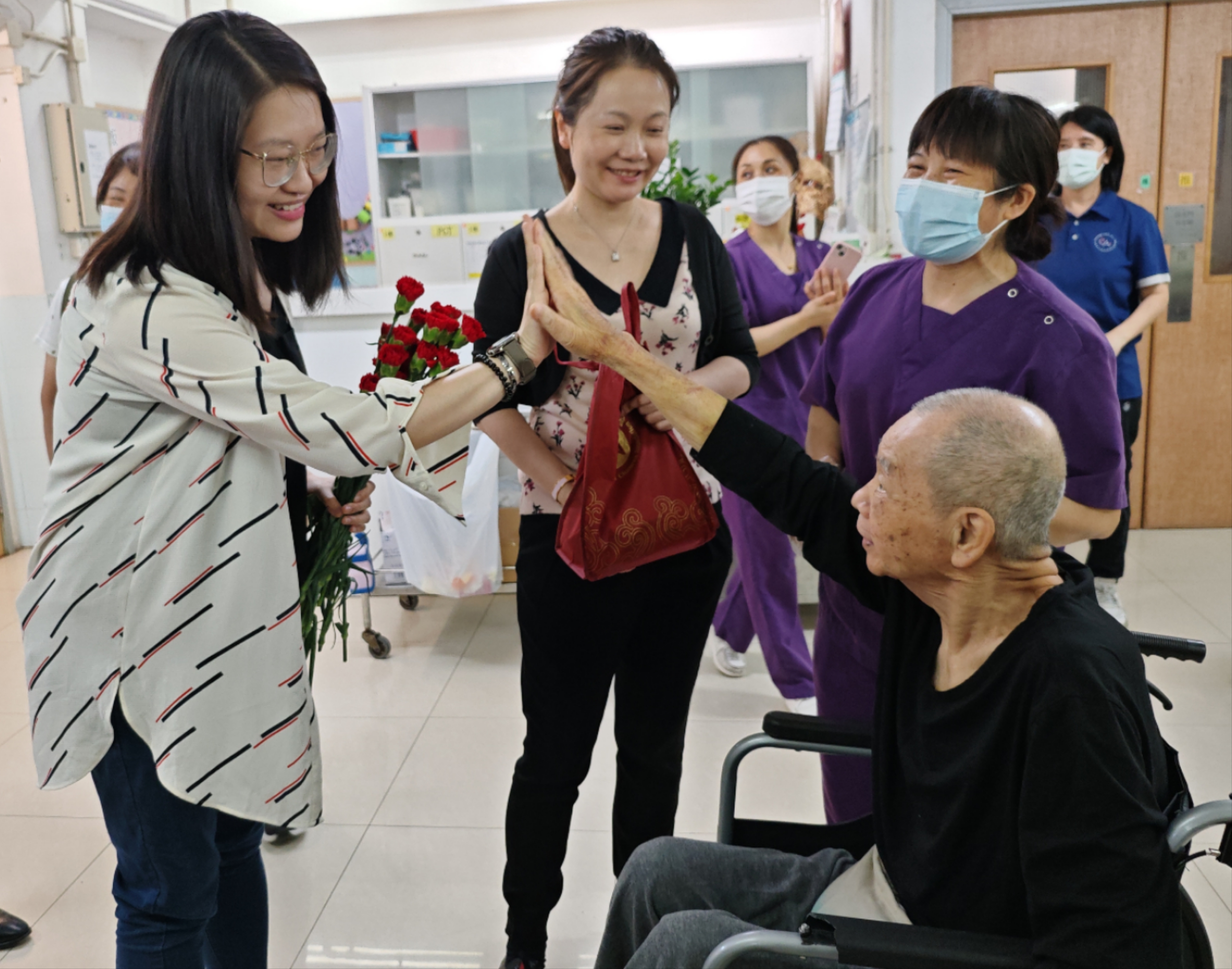 眾人探望長者,並送上鮮花與福袋。