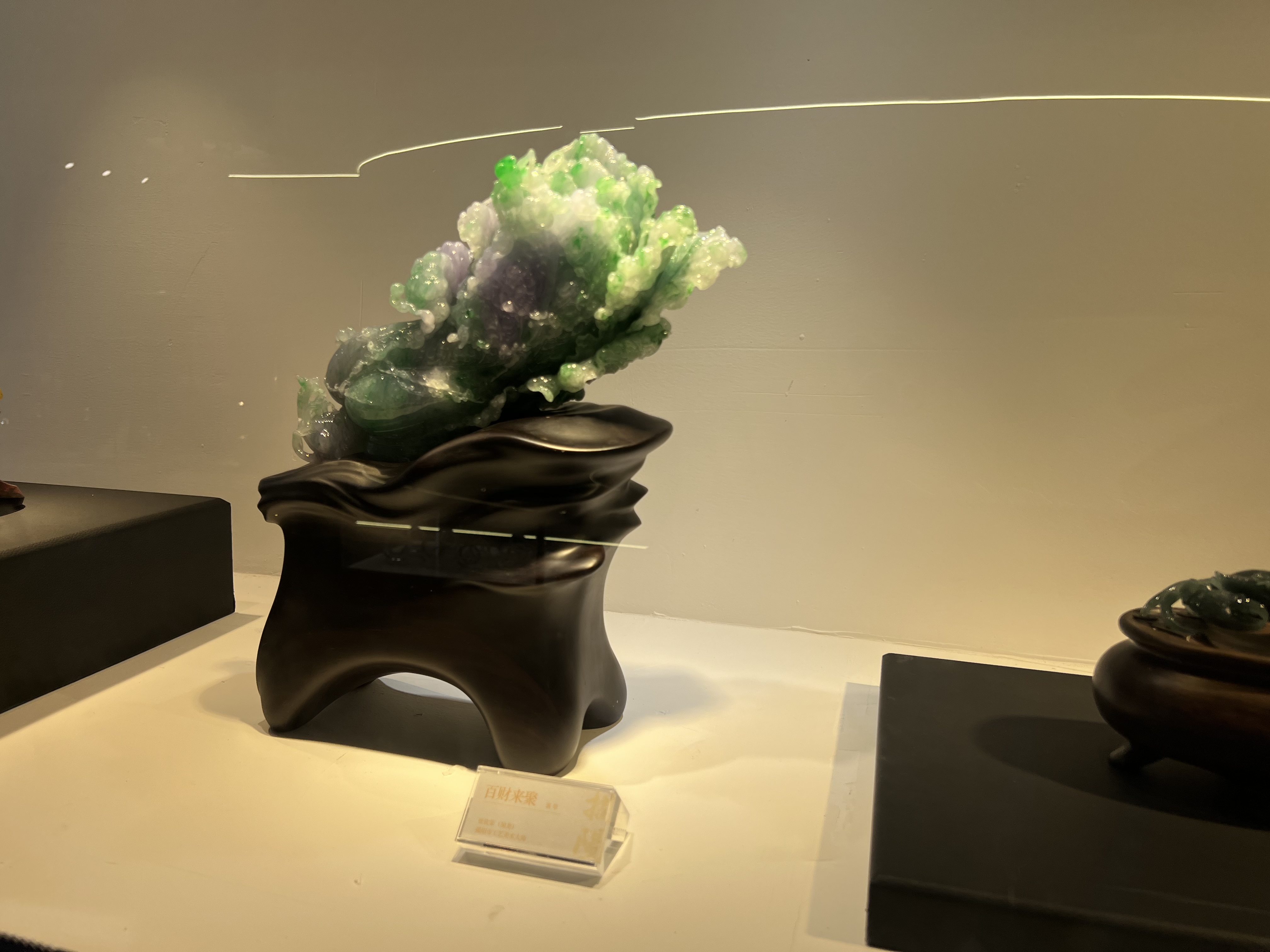 據現場負責人介紹,本屆文博會揭陽展館以「活力古城 中國玉都」為主題,重點突出玉文化產業和農文旅融合發展成果,現場展示了近百件具有揭陽特色的玉雕、木雕、漆器、剪紙、蛋殼畫、樹脂畫、嵌瓷等非遺工藝精品,以及揭陽文創產品和揭陽十佳旅遊手信。特別是《吉祥如意》《凝紫》《白月光》《綠麗佳人》《百財來聚》等一批高端翡翠精品,合計價值超億元,吸引了不少國內外文化業界人士和觀眾駐足鑑賞、拍照打卡。