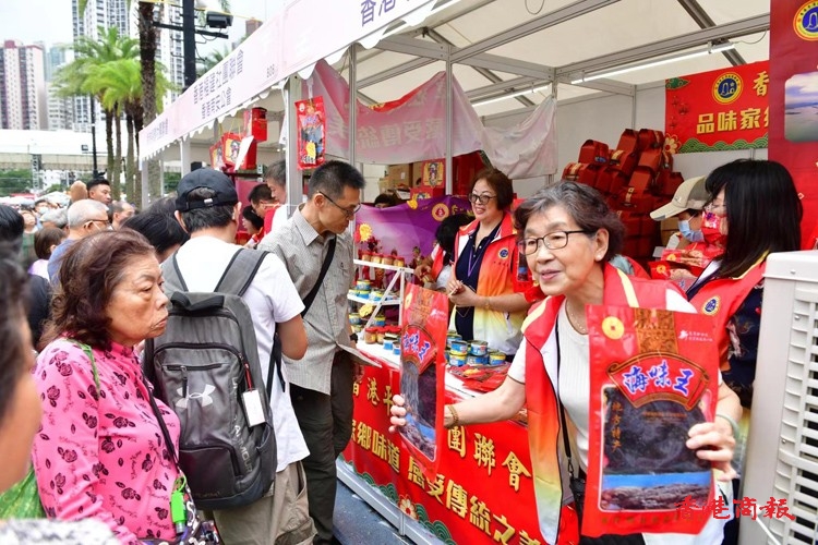 香港平潭社團聯會店員李婆婆落力向客人推銷「皇牌貨」即食紫菜,她說「好抵買」,30元一包,50元2包,可以即食,但用作煲湯味道會更可口。被問到即食紫菜連日來銷量,李婆婆形容「多到數唔晒」,但透露展期首日營業3個小時,生意額達5000元。