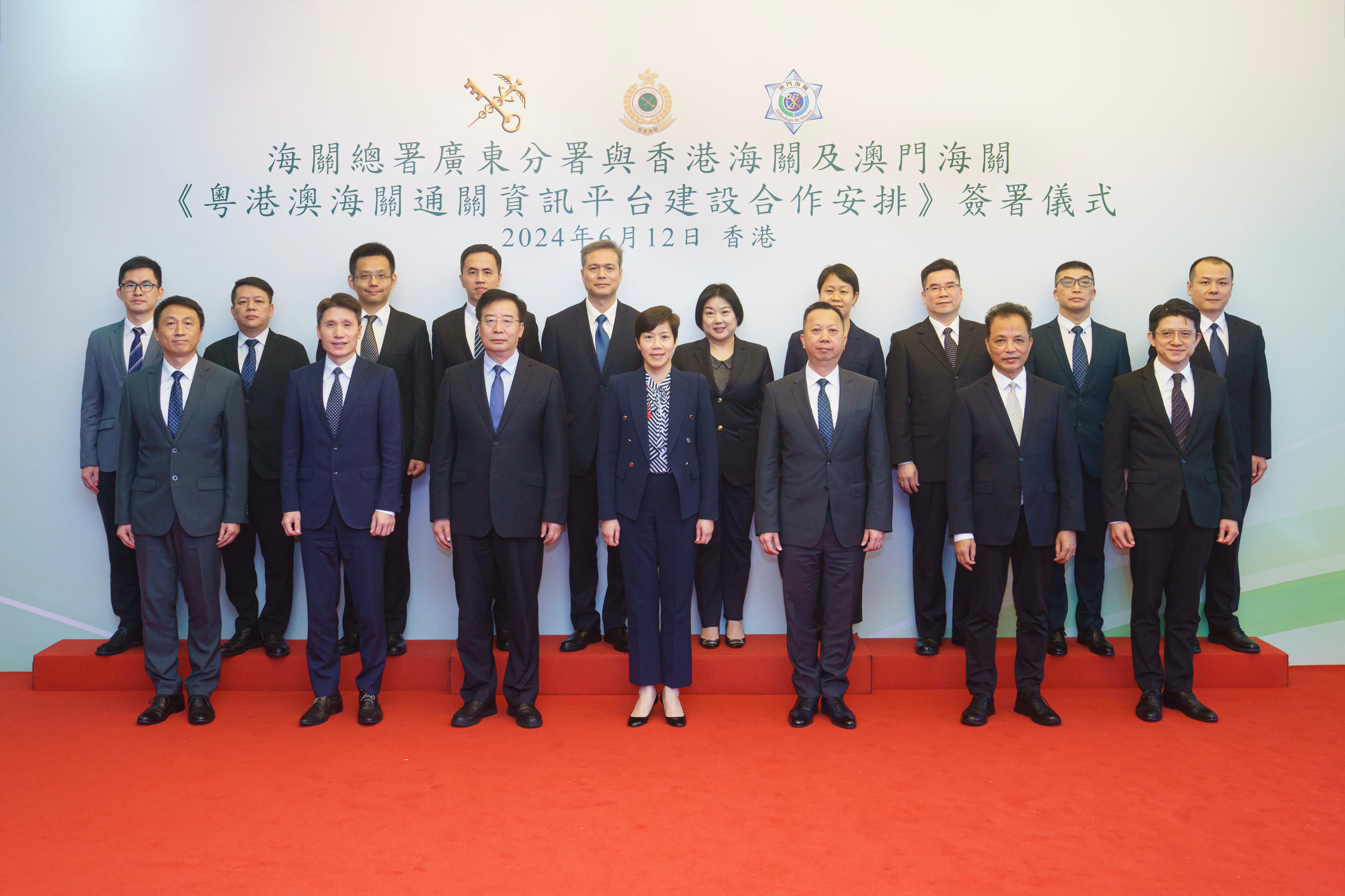 香港海關關長何珮珊與國家海關總署廣東分署主任李魁文及澳門海關關長黃文忠今日(12日)在香港簽署粵港澳海關通關資訊平台建設合作安排,正式展開構建資訊平台的工作。